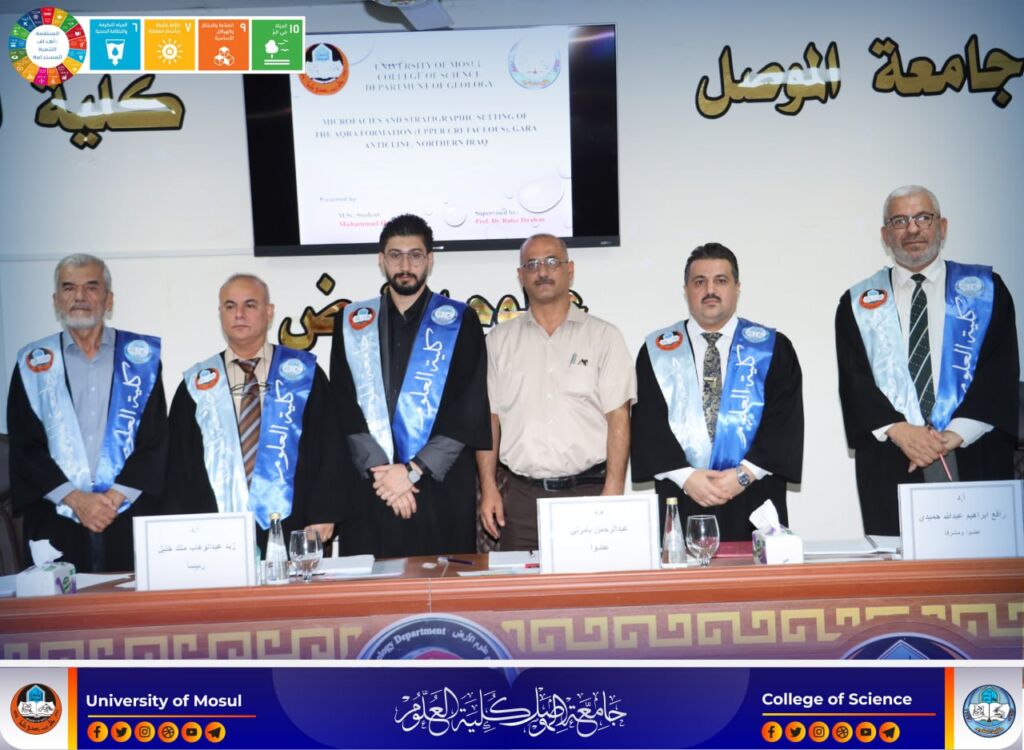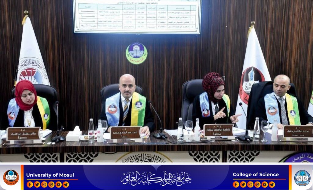 حضر المناقشة السيد رئيس قسم علوم الحياة وطلبة الدراسات العليا وتدريسيو القسم. وقد ترأس لجنة المناقشة الأستاذ الدكتور محسن أيوب عيسى أحمد، وعضوية كل من الأستاذ المساعد الدكتورة خنساء محمد يونس، والمدرس الدكتورة شفق طارق برهان، وبإشراف وعضوية الأستاذ المساعد الدكتورة روجان غانم محمد العلاف.