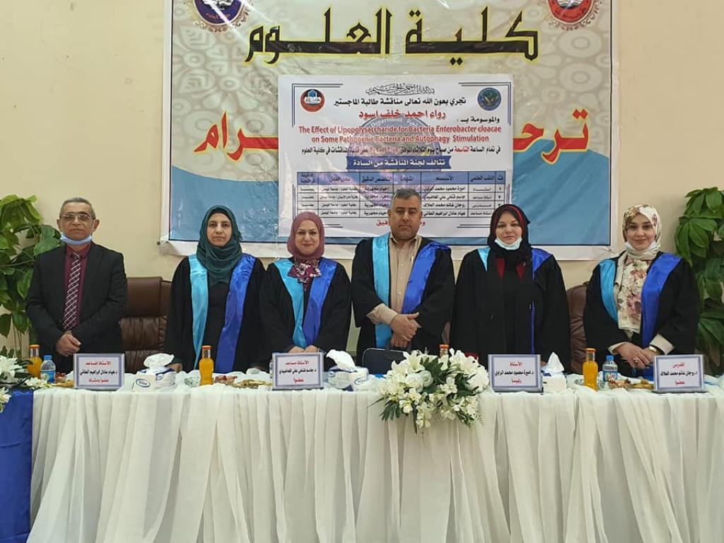 ناقشت كلية العلوم في جامعة الموصل يوم الثلاثاء الموافق 2020/12/8رسالة الماجستير الموسومة “تأثير متعدد السكريات الدهني ل Enterobacter cloacae على بعض البكتريا المرضية وتحفيز الالتهام الذاتي “.اذ خلصت الدراسة التي تقدمت بها الطالبة ( رواء احمد خلف اسود ) الى أن الجراثيم سالبة الجرام هي أكثر الجراثيم عزلًا ومن الانواع ذات المقاومة المتعددة للأدويةMDR. وان معظم الجراثيم المعزولة تنتمي الى مجموعة بكتيريا ESKAPE،كما تبين ان لمضاد Ciprofloxacin القدرة على تثبيط جميع العزلات السالبة لصبغة كرام ،فيما اظهر مضاد Trimethoprim قدرته على تثبيط نمو بكتيريا( MRSA ) Staphylococcus aureus.كما تم الحصول في هذه الدراسة على مستخلص فعال من متعدد السكريات الدهني LPS باستخدام طريقة الكلوروفورم- الميثانول ذو كفاءة عالية في تثبيط النمو الميكروبي لجميع العزلات المستخدمة في الدراسة وفعاليته في تثبيط عزلة proteus mirabilis بكافة التركيزات المستخدمة في الدراسة الحالية فضلا عن قدرة LPS وفاعليته في تحفيز الالتهام الذاتي في الخميرة.تألفت لجنة المناقشة من السادة:أ.د. اميرة محمود محمد الراوي/ جامعة الموصل / كلية العلوم/ رئيسا.أ.م.د جاسم فتحي علي المعاضيدي/ جامعة ميسان/ كلية طب الاسنان/ عضوا.م.د. روجان غانم محمد العلاف / جامعة الموصل / كلية العلوم/ عضوا.أ.م.د. هيام عادل ابراهيم الطائي / جامعة الموصل / كلية العلوم/ عضوا ومشرفا.وقد قدمت السيدة عميد كلية العلوم الاستاذ المساعد الدكتور هيام عادل الطائي كتاب شكر وتقدير الى الاستاذ المساعد الدكتور السيد جاسم فتحي علي المعاضيدي لتكبده عناء السفر ومشاركته مناقشة الطالبة.
