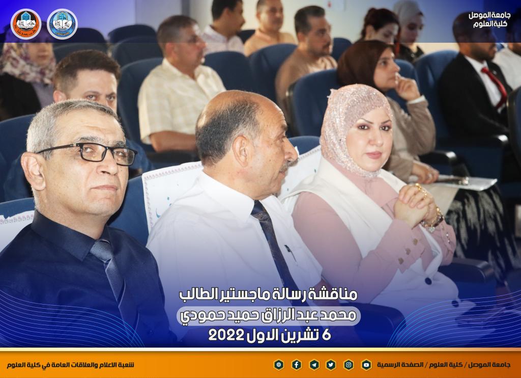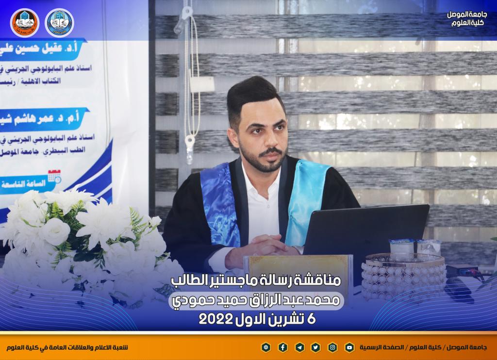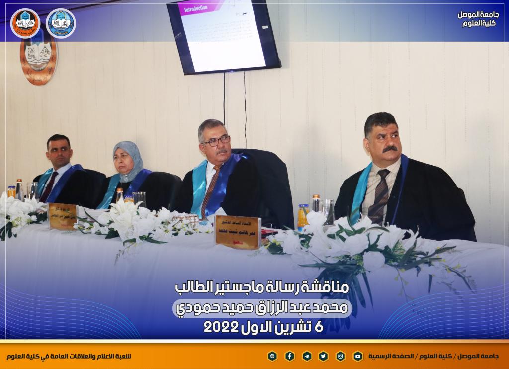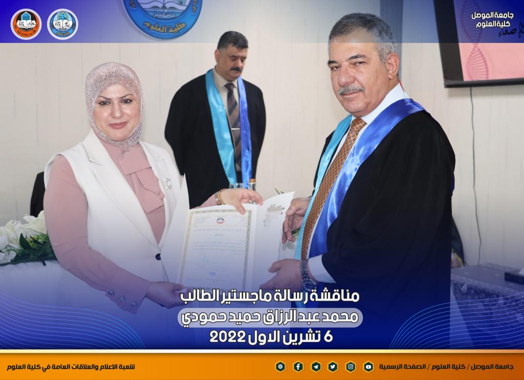 ناقشت كلية العلوم في جامعة الموصل رسالة ماجستير بعنوان (تحديد الطفرات الوراثية للجين الكابح للورم P53 في النساء اللواتي يعانين من سرطان الثدي في مدينة الموصل) يوم الخميس الموافق 6 تشرين الاول 2022 حضر جانبا منها السيدة عميد الكلية الاستاذ الدكتورة هيام عادل ابراهيم والسادة معاوني العميد والسيد رئيس القسم إضافة إلى عدد من تدريسي و طلبة القسم.