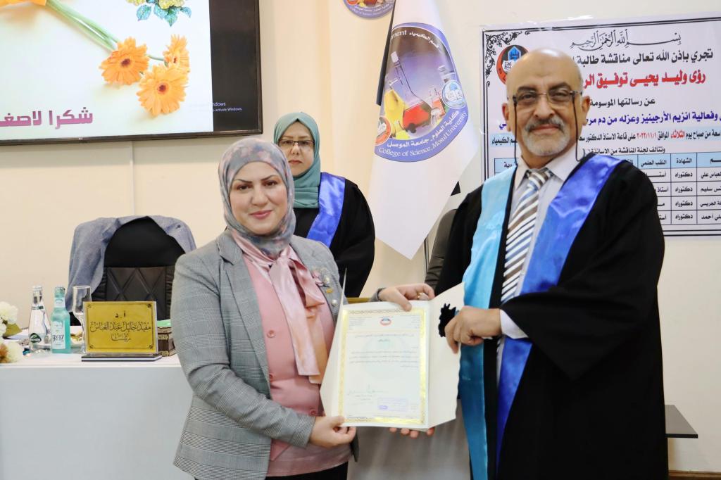 ناقش قسم الكيمياء في كلية العلوم بجامعة الموصل رسالة الماجستير الموسومة ” دراسة خواص وفعالية انزيم الارجنيز وعزله من دم مرضى السكري من النوع الثاني ” يوم الثلاثاء الموافق 1 تشرين الثاني 2022 ، حضر جانبا منها السيدة عميد الكلية الأستاذ الدكتورة هيام عادل الطائي والسيد المعاون العلمي والسيد رئيس القسم وعدد من تدريسيي الكلية .تناولت الرسالة التي تقدمت بها الطالبة ( رؤى وليد يحيى توفيق الرمضاني ) في فرع الكيمياء الحياتية دراسة خواص وفعالية إنزيم الأرجينيز وعزله من دم مرضى السكري من النوع الثاني .هدفت الدراسة إلى عزل الأرجينيز وتنقيته جزئيا ً من مصل مرضى السكري من النوع الثاني الغير صائمين ، وتقدير وزنه الجزيئي ودراسة الظروف المثلى و تأثير الاملاح المعدنية على إنزيم الأرجينيز المنقى.تطرقت الدراسة الى استخدام خطوات تنقية لتنقية الأرجينيز: ترسيب البروتين بكبريتات الأمونيوم عند تشبع 65%، كروماتوغرافيا التبادل الأيوني DEAE- السليلوز، وتقنية نثر الهلام Sephadex G-100. .أظهرت النتائج وجود ارتفاع معنوي في مستوى فعالية الأرجينيز في مرضى السكري من النوع الثاني الغير صائمين والصائمين مقارنة بمجموعة السيطرة، كما أظهرت النتائج عدم تأثر مستوى فعالية الأرجينيز بعاملي الجنس والعمر وكذلك عدم تأثره بالصيام في كل من مجموعة مرضى السكري وفي مجموعة السيطرة.ترأس لجنة المناقشة الأستاذ الدكتور مفيد جليل عبد العباس من كلية الطب / جامعة بابل وعضوية كل من الأستاذ المساعد الدكتورة نوال ذنون يونس من كلية التربية للبنات / جامعة الموصل و المدرس الدكتورة أمل طه ياسين ، وبإشراف الأستاذ الدكتورة زهراء محمد علي أحمد.شعبة الإعلام والعلاقات العامةالثلاثاء 1 تشرين الثاني 2022