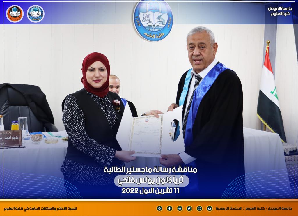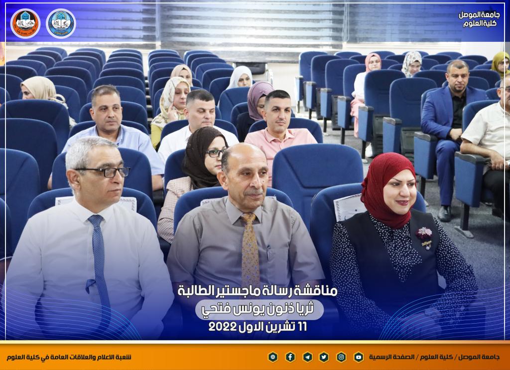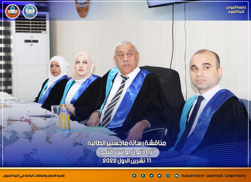 ناقشت كلية العلوم في جامعة الموصل رسالة ماجستير بعنوان (دور المقاوم الحيوي Aureobasidium في امراضية بعض الفطريات المصاحبة لبذور الشعير المخزونة في شركات انتاج البذور في محافظة نينوى ) يوم الثلاثاء الموافق 11 تشرين الاول 2022، حضر جانبا منها السيدة عميد الكلية الاستاذ الدكتورة هيام عادل ابراهيم والسيد المعاون العلمي والسيد رئيس القسم وعدد من تدريسي الكلية.