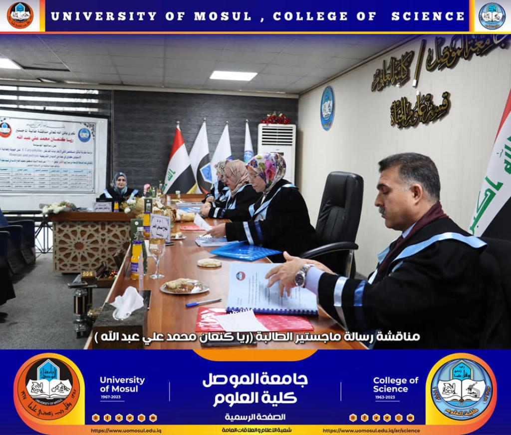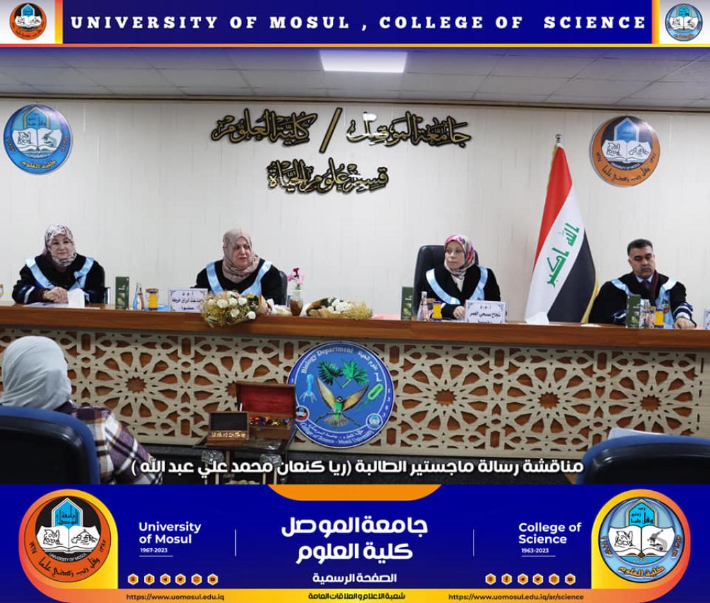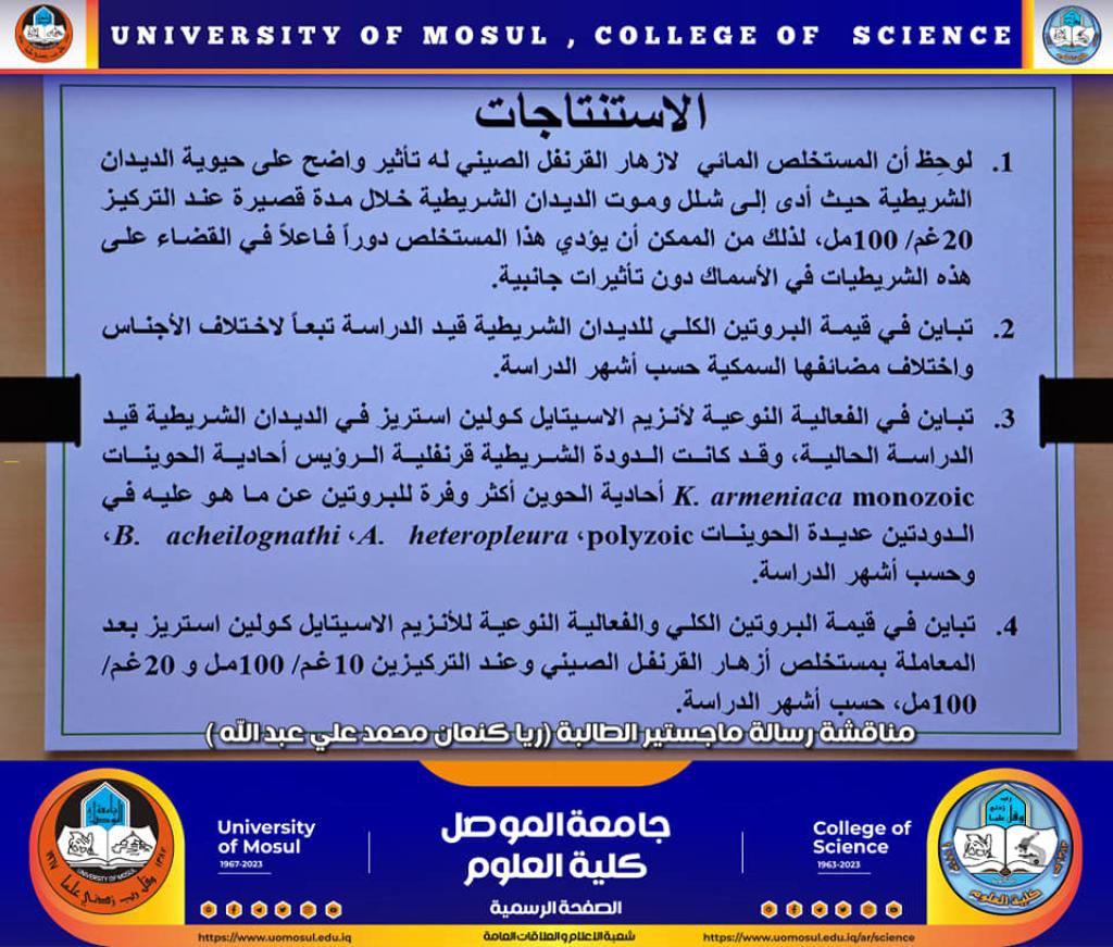 ناقش قسم علوم الحياة بكليه العلوم في جامعة الموصل رساله ماجستير بعنوان ” دراسة مقارنه لتأثير المستخلص المائي لأزهار نبات القرنفل E caryophyllus على حيوية وفعالية انزيم الاسيتايل كولين في عدد من الديدان الشريطيه Monozoic and polyzoic ) يوم الإثنين الموافق 30 كانون الثاني 2023.حضر جانباً منها السيدة عميد الكلية الأستاذ الدكتورة هيام عادل إبراهيم والساده معاوني العميد والسيد رئيس القسم وعدد من تدريسي الكلية .تناولت الدراسة التي تقدمت بها الطالبة ( ريا كنعان محمد علي ) من فرع الحيوان عدد من المحاور منها: بيان تأثير المستخلص المائي لأزهار نبات القرنفل وبتراكيز 10و20 غم /100مل على حيوية الديدان الشريطية المتطفلة في الأسماك , أظهرت النتائج ان مدة شلل وموت الديدان (القتل التدريجي ) كانت أقل عند التركيز 20 غم /100مل عنها عند التركيز 10غم /100مل.كما أظهرت النتائج تباين قيم البروتين الكلي للديدان الشريطية تبعاً لاختلاف الاجناس واختلاف مضائفها كما تباينت الفعالية النوعية لانزيم الاسيتايل كولين استريز (AchE) في الديدان الشريطية وكانت الدودة قرنفليه الرؤيس K.armeniaca اكثر وفرة للبروتين عن ما هو عليه في الدودتين A.heteropleura, ،B.acheilognathi وحسب أشهر الدراسة.ترأس لجنه المناقشة الأستاذ المساعد الدكتورة نجاح صبحي نايف وعضوية كل من الأستاذ المساعد الدكتورة وحدة عبد الرزاق محمود والأستاذ المساعد الدكتور أحمد عقيل خضير من جامعة هولير الطبية وبإشراف الأستاذ الدكتورة سندس نذير حميد.شعبة الإعلام والعلاقات العامةالإثنين 30 كانون الثاني 2023