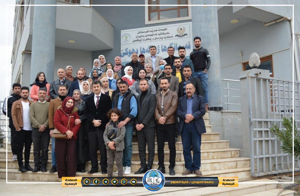 برعاية السيد رئيس جامعة الموصل الأستاذ الدكتور قصي كمال الدين الأحمدي المحترم ، واشراف السيدة عميد كلية العلوم الأستاذ الدكتورة هيام عادل إبراهيم ، نظّم قسم الكيمياء زيارة علمية لطلبة الدراسات العليا الى دائرة بيئة دهوك برفقة العديد من تدريسي القسم وذلك يوم الخميس الموافق 3 آذار 2022 .شملت الزيارة القيام بجولة تعريفية لجميع المختبرات والأجهزة المعتمدة في التحليلات البيئية المستخدمة والمعتمدة في السيطرة البيئة فضلاً عن العديد من المناقشات العلمية المستفيضة بين الطلبة ومسؤولي المختبرات.قدّم الوفد التدريسي المرافق تحيات وشكر السيدة العميد لإدارة الدائرة والممثلة بالأستاذ دلشاد عبدالرحمن محمد للتعاون البنّاء وحفاوة الاستقبال للتدريسين والطلبة .