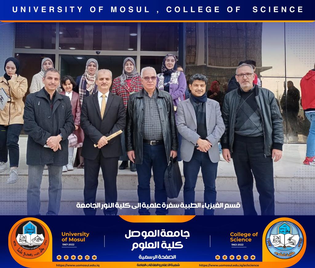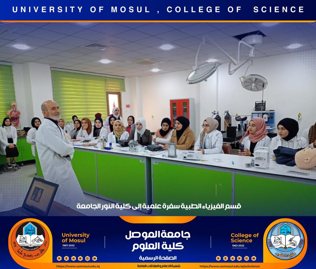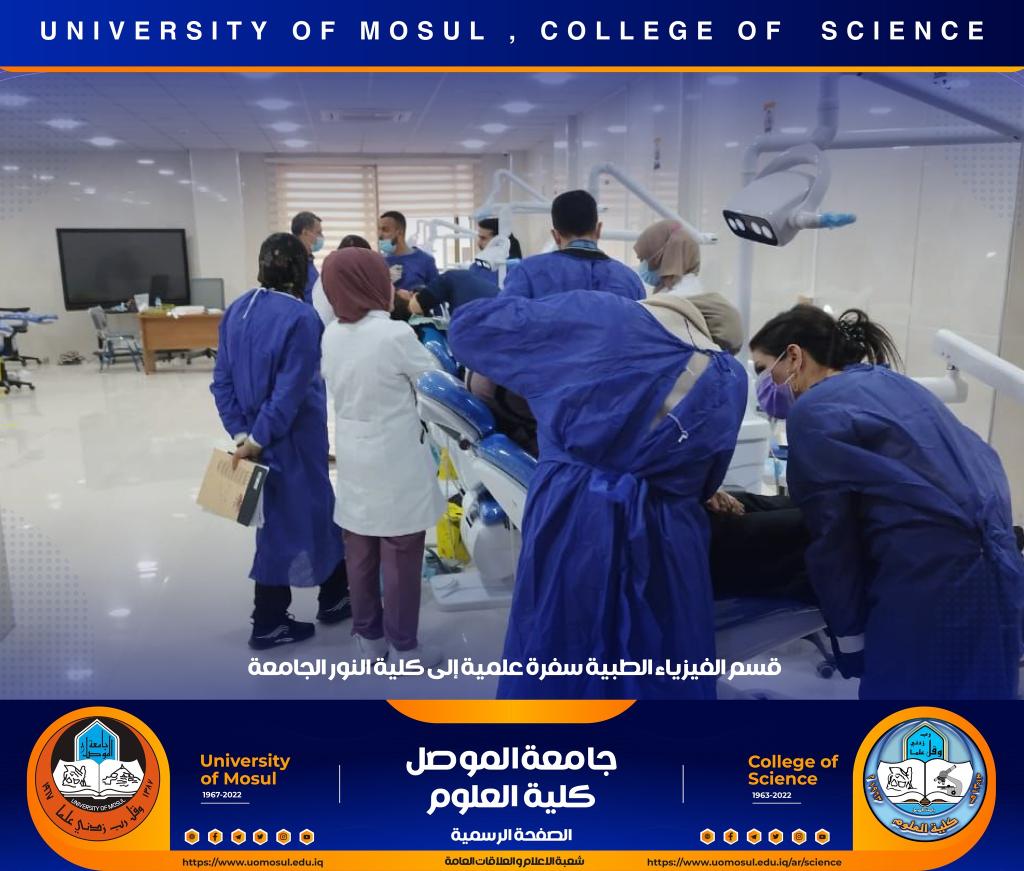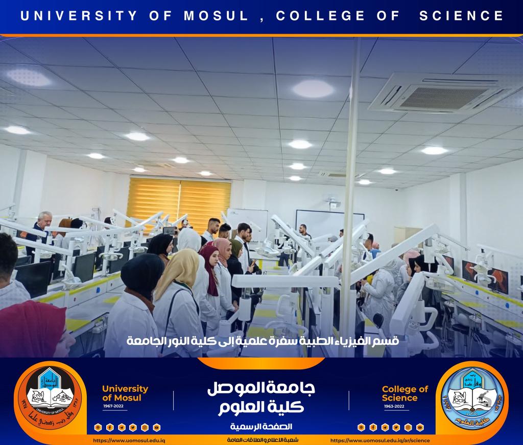 برعاية السيد رئيس جامعة الموصل الأستاذ الدكتور قصي كمال الدين الأحمدي وبإشراف السيدة عميد كلية العلوم الأستاذ الدكتورة هيام عادل إبراهيم ، نظّم قسم الفيزياء الطبية في كليتنا سفرة علمية لطلبة المرحلة الثالثة الى كلية النور الجامعة الأهلية صباح يوم الثلاثاء الموافق 20 كانون الأول 2022 رافقهم خلالها السيد رئيس القسم أ.م.د. مروان زهير الياس وعدد من تدريسيه.هدفت الزيارة الى الاطلاع على طبيعة المختبرات العلمية وما تتضمنه من أجهزة طبية علمية حيث قُدم شرحاً وافياً من قبل الأساتذة المرافقين لكل مختبر تم زيارته (مختبرات التشريح والتخدير ، البصريات، الفسلجة ، الفسلجة الطبية ،الفيزياء الطبية وعيادات طب الأسنان العلاجية) إضافة الى التطور الهائل في هذه المختبرات واستخدام التقنيات الرقمية فيها.في ختام الزيارة عبّر الوفد عن شكره وتقديره للحفاوة وحسن الاستقبال والتعاون المثمر في هذا المجال.شعبة الإعلام والعلاقات العامةالسبت 24 كانون الأول 2022