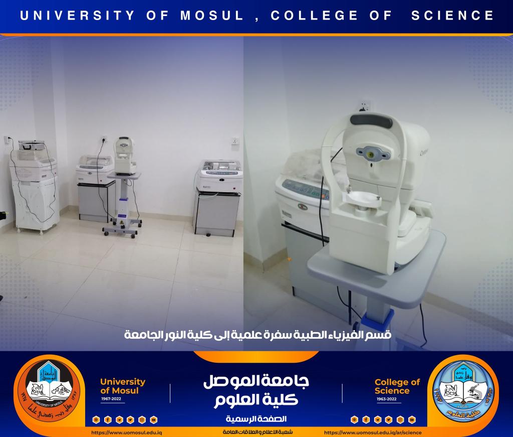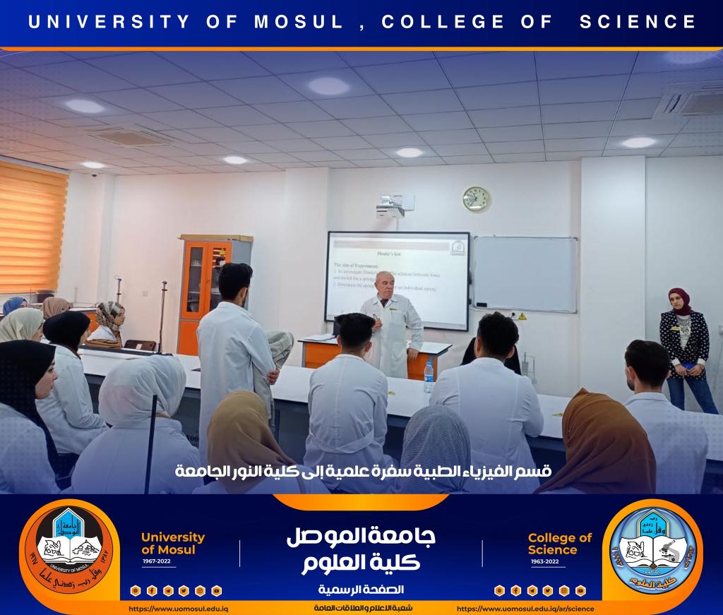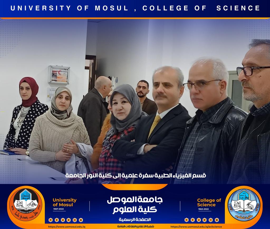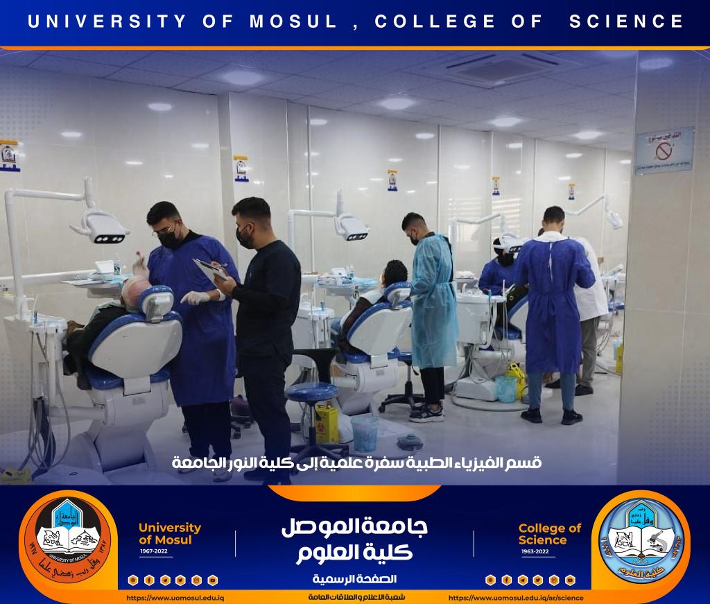 برعاية السيد رئيس جامعة الموصل الأستاذ الدكتور قصي كمال الدين الأحمدي وبإشراف السيدة عميد كلية العلوم الأستاذ الدكتورة هيام عادل إبراهيم ، نظّم قسم الفيزياء الطبية في كليتنا سفرة علمية لطلبة المرحلة الثالثة الى كلية النور الجامعة الأهلية صباح يوم الثلاثاء الموافق 20 كانون الأول 2022 رافقهم خلالها السيد رئيس القسم أ.م.د. مروان زهير الياس وعدد من تدريسيه.هدفت الزيارة الى الاطلاع على طبيعة المختبرات العلمية وما تتضمنه من أجهزة طبية علمية حيث قُدم شرحاً وافياً من قبل الأساتذة المرافقين لكل مختبر تم زيارته (مختبرات التشريح والتخدير ، البصريات، الفسلجة ، الفسلجة الطبية ،الفيزياء الطبية وعيادات طب الأسنان العلاجية) إضافة الى التطور الهائل في هذه المختبرات واستخدام التقنيات الرقمية فيها.في ختام الزيارة عبّر الوفد عن شكره وتقديره للحفاوة وحسن الاستقبال والتعاون المثمر في هذا المجال.شعبة الإعلام والعلاقات العامةالسبت 24 كانون الأول 2022