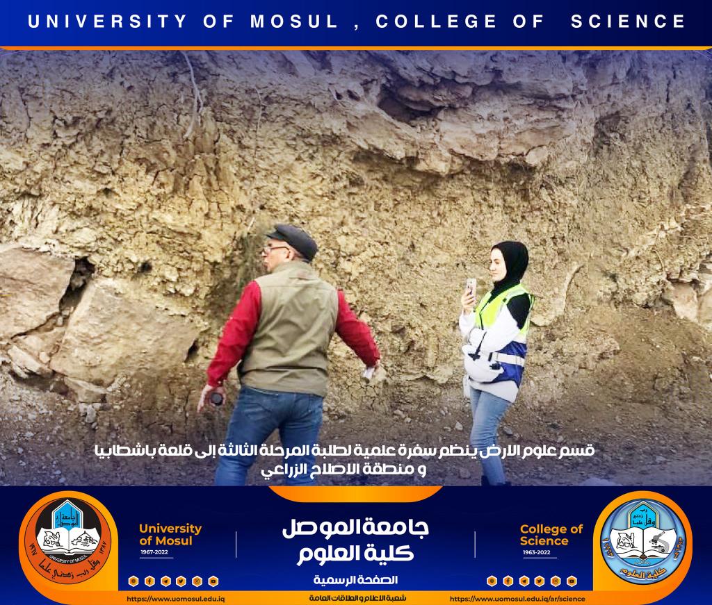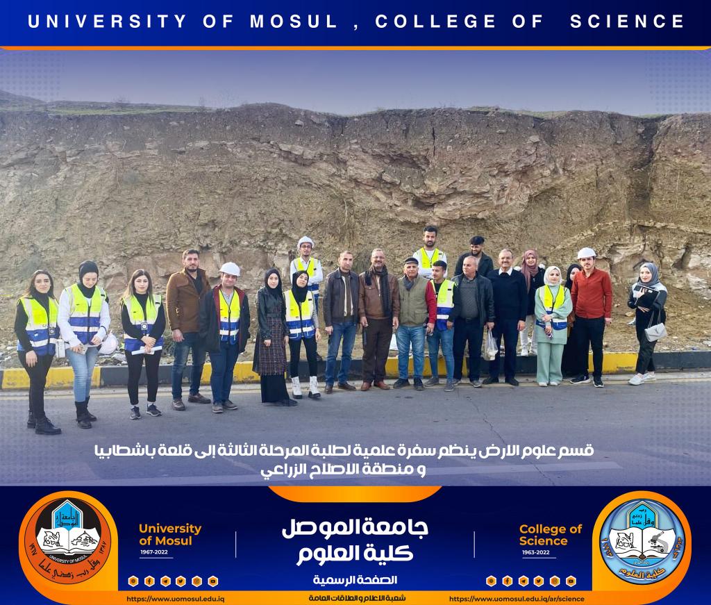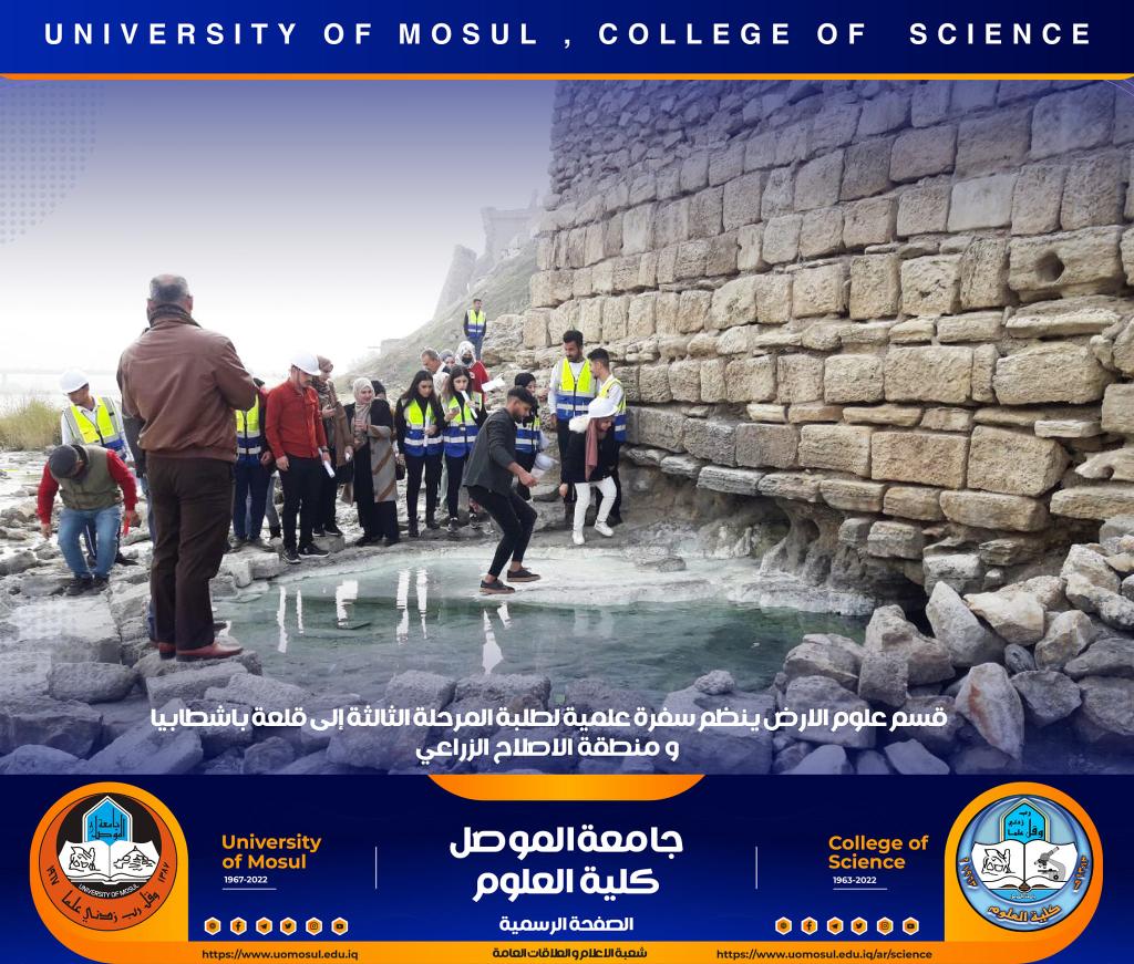تنفيذاً لتوجيهات السيدة عميد كلية العلوم الأستاذ الدكتورة هيام عادل إبراهيم ، نظّم قسم علوم الأرض في كليتنا سفرة علمية حقلية لطلبة المرحلة الثالثة إلى منطقة الإصلاح الزراعي وقلعة باشطابيا في الجانب الأيمن من مدينة الموصل وذلك صباح يوم الخميس الموافق 15 كانون الأول 2022.أشرف على السفرة السيد رئيس قسم علوم الأرض د. عمر أحمد مولود و د. زيد عبدالوهاب ملك و د. محمد الحاج و د. ربيع خلف حسن وعدداً من أساتذة القسم ، و هدفت الى تعريف الطلبة بطبيعة الصخور التي تنكشف في المنطقة وكذلك طبيعة العيون الكبريتية الموجودة بالقرب من قلعة باشطابيا .تمنياتنا لطلبتنا بالتوفيقشعبة الإعلام والعلاقات العامةالسبت 17 كانون الأول 2022