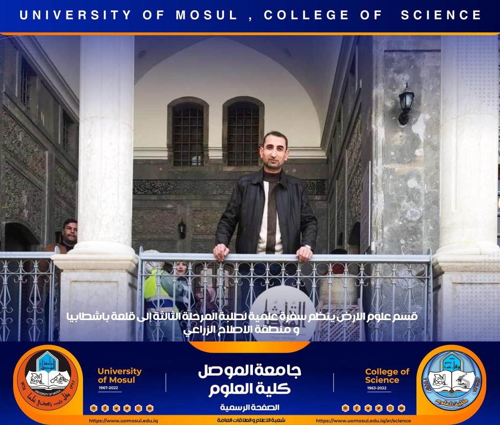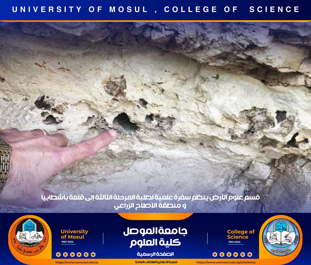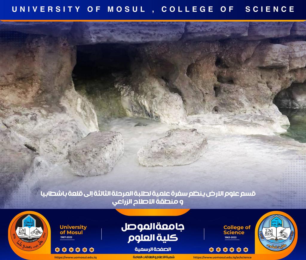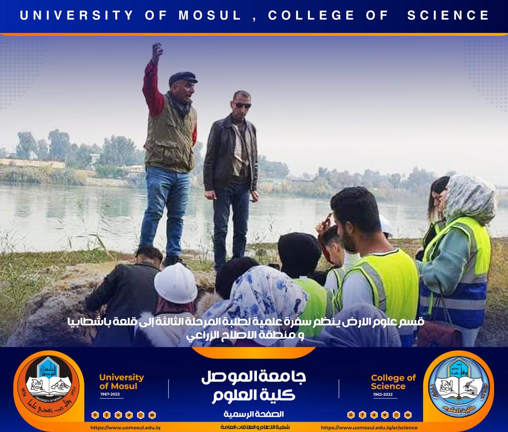 تنفيذاً لتوجيهات السيدة عميد كلية العلوم الأستاذ الدكتورة هيام عادل إبراهيم ، نظّم قسم علوم الأرض في كليتنا سفرة علمية حقلية لطلبة المرحلة الثالثة إلى منطقة الإصلاح الزراعي وقلعة باشطابيا في الجانب الأيمن من مدينة الموصل وذلك صباح يوم الخميس الموافق 15 كانون الأول 2022.أشرف على السفرة السيد رئيس قسم علوم الأرض د. عمر أحمد مولود و د. زيد عبدالوهاب ملك و د. محمد الحاج و د. ربيع خلف حسن وعدداً من أساتذة القسم ، و هدفت الى تعريف الطلبة بطبيعة الصخور التي تنكشف في المنطقة وكذلك طبيعة العيون الكبريتية الموجودة بالقرب من قلعة باشطابيا .تمنياتنا لطلبتنا بالتوفيقشعبة الإعلام والعلاقات العامةالسبت 17 كانون الأول 2022