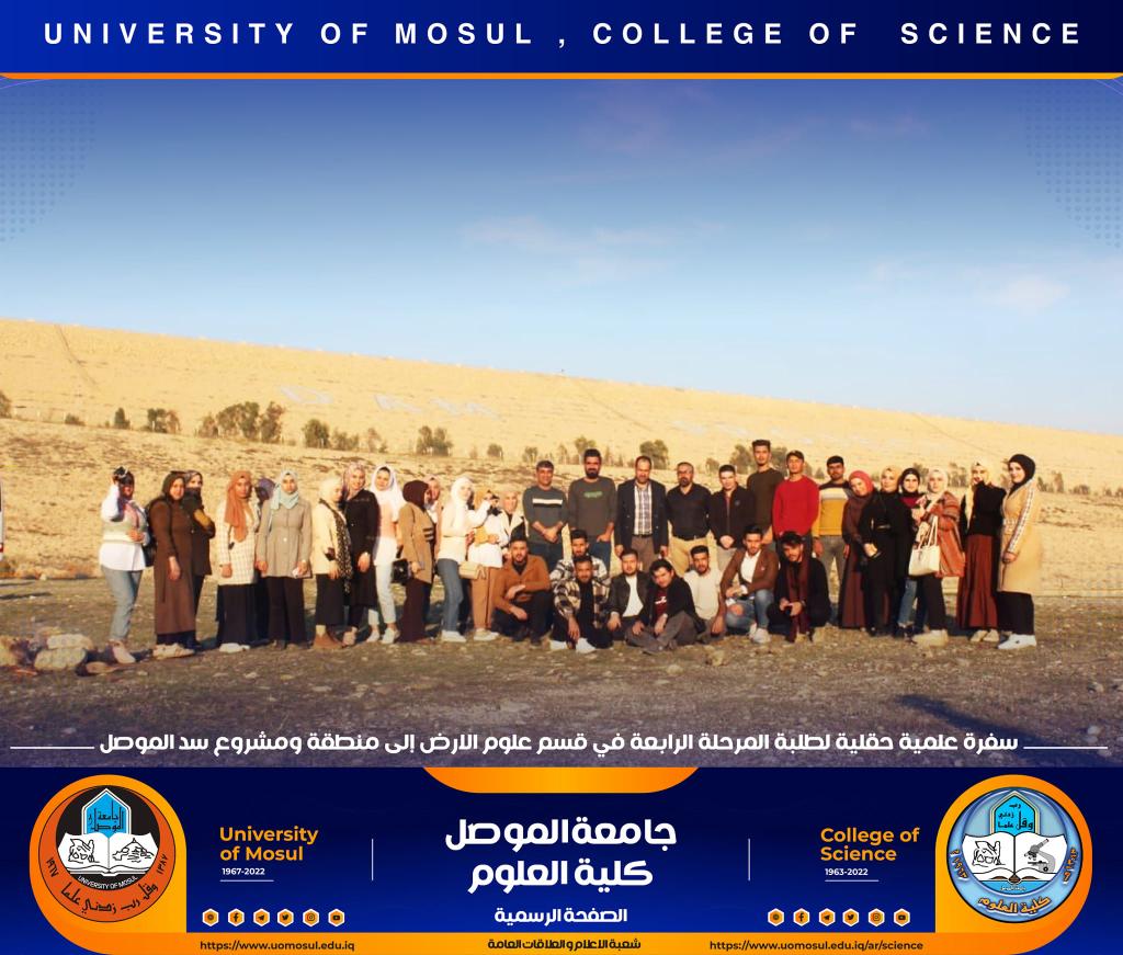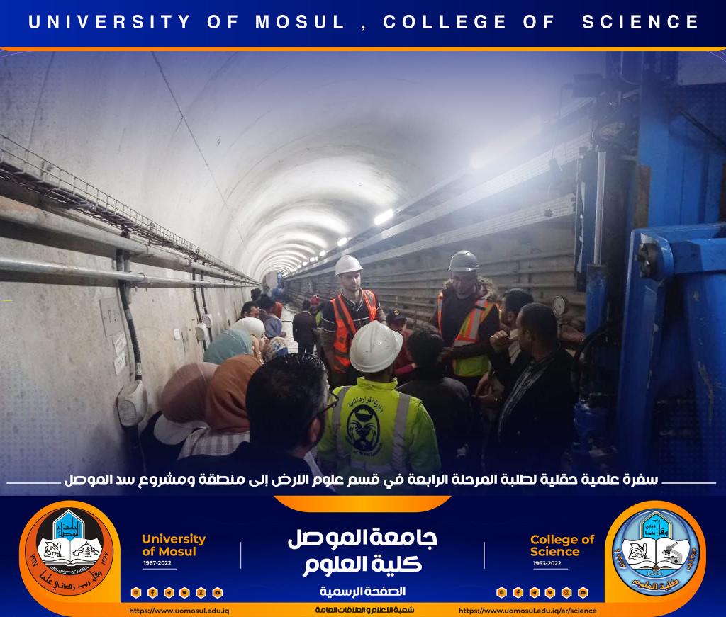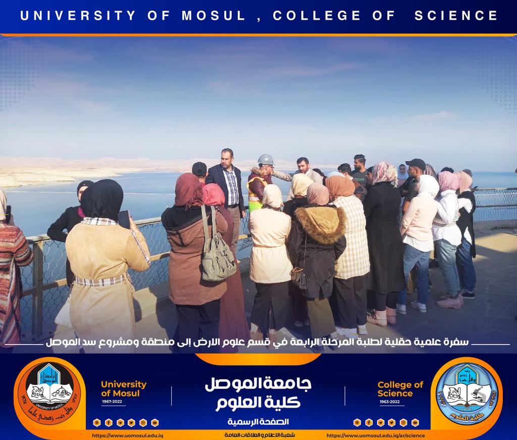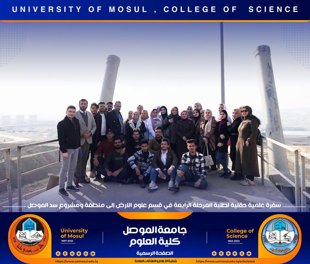تنفيذاً لتوجيهات السيدة عميد كلية العلوم الأستاذ الدكتورة هيام عادل إبراهيم المحترمة ، نظّم قسم علوم الأرض في كليتنا سفرة علمية حقلية لطلبة المرحلة الرابعة إلى مشروع سد الموصل وذلك صباح يوم الخميس الموافق 8 كانون الأول 2022.أشرف على السفرة الدكتور فلاح عبد محمد المعماري وعدداً من أساتذة القسم ، و هدفت الى تعريف الطلبة على طبيعة الصخور والتكوينات الجيولوجية لطيتي بطمة الشرقية والغربية التي أقيم عليها سد الموصل وكذلك طبيعة عمل الجيولوجي ودوره في انشاء السدود وفي متابعة وضعية وحماية السد من خلال أعمال التحشية المستمرة بسبب ذوبان الصخور المستمر .تمنياتنا لطلبتنا بالتوفيقشعبة الإعلام والعلاقات العامةالجمعة 9 كانون الأول 2022