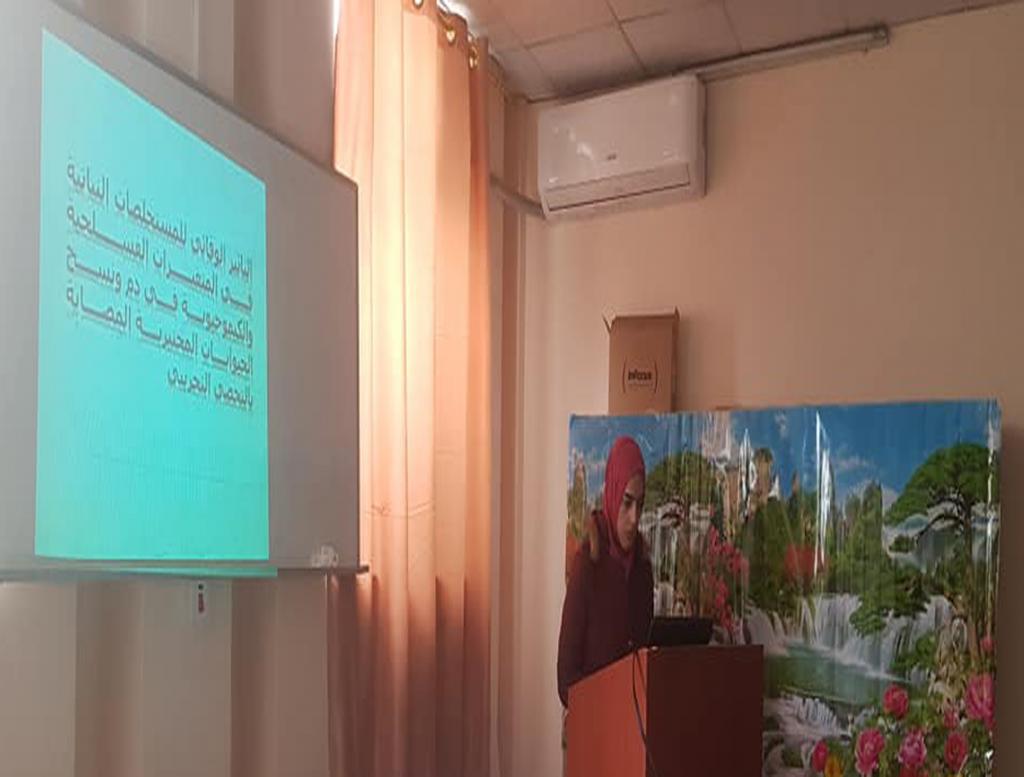 القت طالبة الماجستير داليا صالح مصطفى من قسم علوم الحياة كلية العلوم حلقة دراسية بعنوان " اختبارات مصلية للتحري عن طفيلي Toxoplasma gondiiمع دراسة وبائية للطفيلي في بعض نساء محافظتي نينوى وبغداد للعام ٢٠١٧_٢٠١٨"