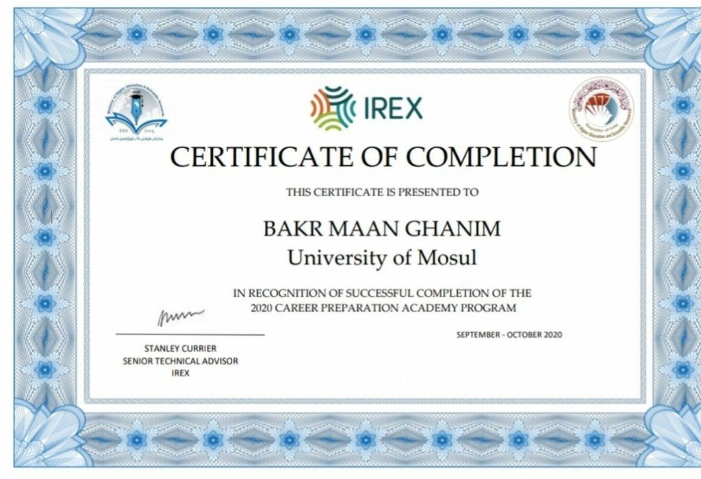 استمراراً لتميز و إبداع كلية العلوم بطلابها ومنتسبيها أكمل طالب المرحلة الرابعة في كلية العلوم / قسم الفيزياء ( بكر معن غانم ) الكورس التدريبي لمؤوسسة IREX بالتعاون مع وزارة التعليم العالي والبحث العلمي والسفارة الامريكية في بغداد بعنوان “career preparation academy” لمدة 8 أسابيع ، شمل التدريب مواضيع عدة منها العمل في العصر الرقمي ومهارات التسويق الذاتي والعقلية الريادية و مهارات استخدام موقع linkedIn. إذ شمل التدريب ١٠٠٠ ممثل من الطلبة عن جميع الكليات في الجامعات العراقية كافة
