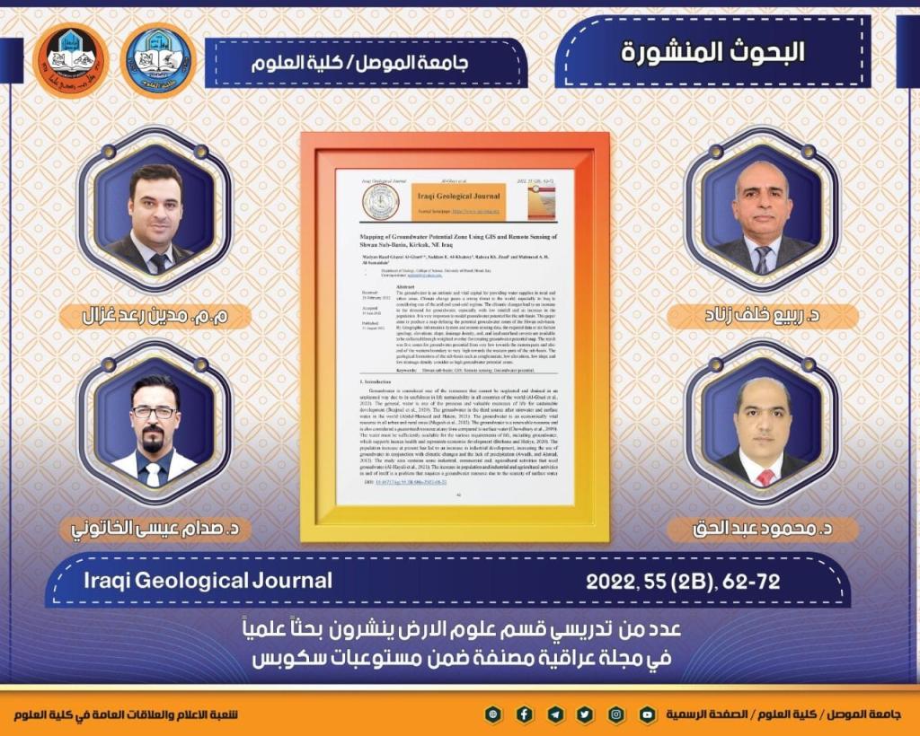 نشر المدرس المساعد مدين رعد غزال التدريسي بقسم علوم الأرض في كليتنا بحثان علميان في المجلة العراقية لعلوم الأرض Iraqi Geological Journal المصنفة ضمن مستوعبات سكوبس ، حيث كان البحث الأول بالاشتراك مع الدكتور محمد شيت محمد رمزي من قسم علوم الأرض في كليتنا أيضاً ، والسيدة لينا حسين من مديرية تربية نينوى ، اضافة الى السيد رأفت بشير شيت من كلية التربية للعلوم الانسانية و كان عنوانه :”Mapping Groundwater Risk Using Geographic Information Systems and QGIS Techniques of the Upper Al-Sanaf Marsh Sub Basin in Maysan, Southern Iraq”أما البحث الثاني فكان بالاشتراك مع الدكتور صدام عيسى الخاتوني والدكتور ربيع خلف زناد اضافة الى الدكتور محمود عبد الحق الصميدعي من قسم علوم الأرض بالعنوان :”Mapping of Groundwater Potential Zone Using GIS and Remote Sensing of Shwan Sub-Basin, Kirkuk, NE Iraq”تمنياتنا لمنتسبي الكلية التوفيق والعطاء الدائمشعبة الإعلام والعلاقات العامةالأحد 11 أيلول 2022