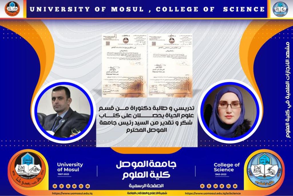 عدد من تدريسي كلية العلوم يسجلون تتابع جينومي بكتيري كامل و يحصلون على كتاب شكر و تقدير من السيد رئيس جامعة الموصل المحترم