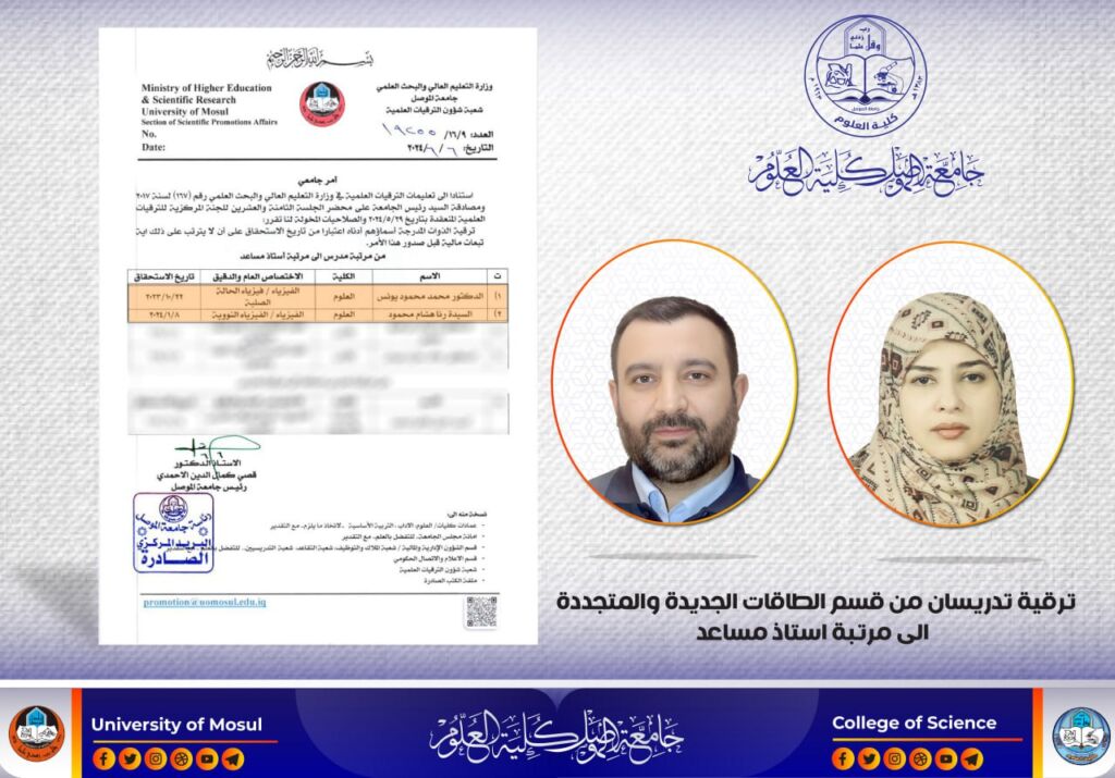 برعاية السيد رئيس جامعة الموصل الأستاذ الدكتور (قصي كمال الدين الأحمدي) المحترم، وبمتابعة السيدة عميد كلية العلوم الأستاذ الدكتورة (هيام عادل إبراهيم الطائي) المحترمة، وضمن إطار التعاون بين جامعة الموصل ومؤسسات الدولة، إستضاف قسم علوم الأرض في كليتنا فريقاً من المفوضية العليا المستقلة للإنتخابات / فرع مكتب نينوى يوم الاربعاء الموافق 5 حزيران 2024 لغرض تحديث بيانات الناخبين من منتسبي جامعة الموصل وطلبتها، وإصدار بطاقات ناخب جديدة للذين لايمتلكونها، وسيستمر تواجدهم لغاية يوم الخميس الموافق 13 حزيران 2024.