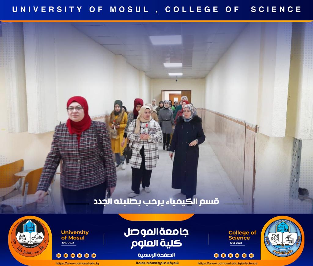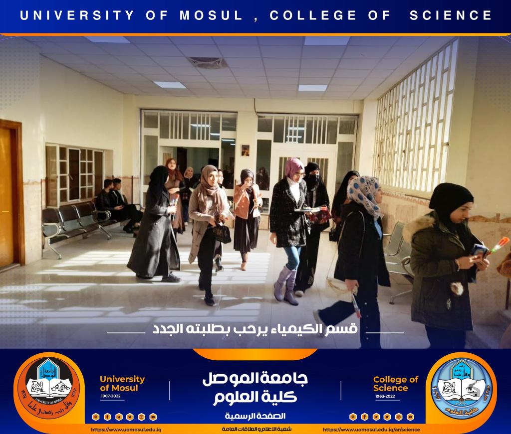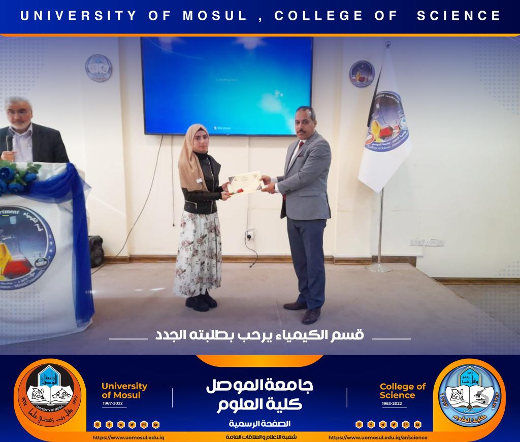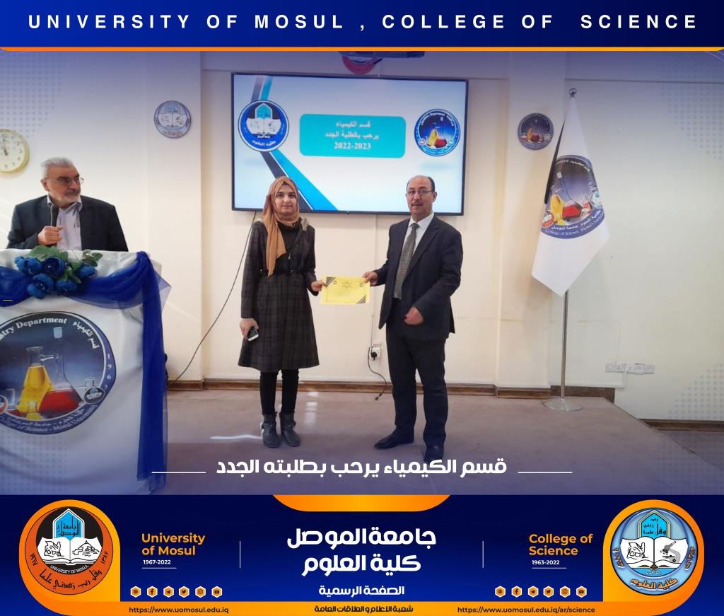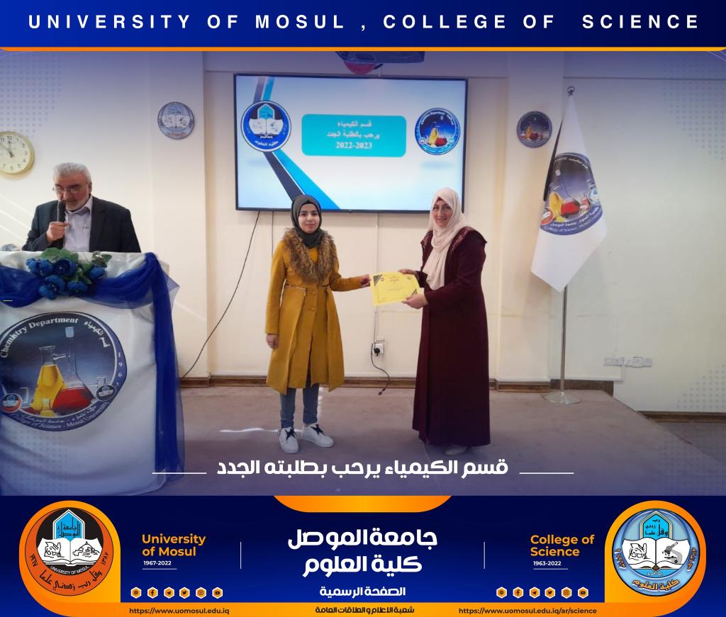 بتوجيه السيدة عميد كلية العلوم الأستاذ الدكتورة هيام عادل إبراهيم وباشراف السيد رئيس قسم الكيمياء الأستاذ الدكتور سالم جاسم ، وضمن فعاليات استقبال الطلبة الجدد نظّم قسم الكيمياء في كليتنا ورشة عمل تحت عنوان ” ارشادات السلامة في مختبرات الكيمياء ” .تضمنت الفعالية نبذة عن قسم الكيمياء والهيكلية الادارية للعمادة والقسم تلاها توجيهات تربوية إرشادية و تعليمات طلابية عامة تخص الطلبة من تعليمات انضباط الطلبة و التعليمات الامتحانية والتوجيهات العامة للطلبة الجدد.كما تمّ القاء محاضرة عن مخاطر المواد الكيميائية و عمل جولة تعريفية داخل أروقة القسم للتعرف على القاعات والمختبرات التي سيستخدمها الطلبة .القيت كذلك محاضرة عن الممارسة المختبرية الجيدة تضمنت التأكيد على استخدام وسائل الأمان داخل المختبر من ارتداء الصدرية والنظارات الواقية والكفوف بعدها تم توزيع شهادات المشاركة للطلبة .شعبة الإعلام والعلاقات العامةالثلاثاء 6 كانون الأول 2022