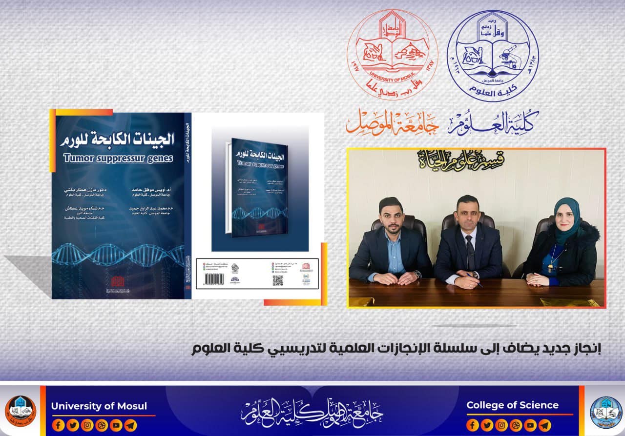 أسرة كلية العلوم ممثلة بالسيدة العميد الأستاذ الدكتورة هيام عادل إبراهيم تتقدم بأجمل عبارات التهاني للتدريسي في قسم علوم الحياة الأستاذ الدكتور أويس موفق حامد والدكتورة نور مازن عطار باشي والمدرس المساعد محمد عبد الرزاق حميد بمناسبة الانجاز العلمي الذي حققوه في تأليفهم لكتابٍ علميٍ بعنوان” الجينات الكابحة للورم Tumor Suppressor Genes ”