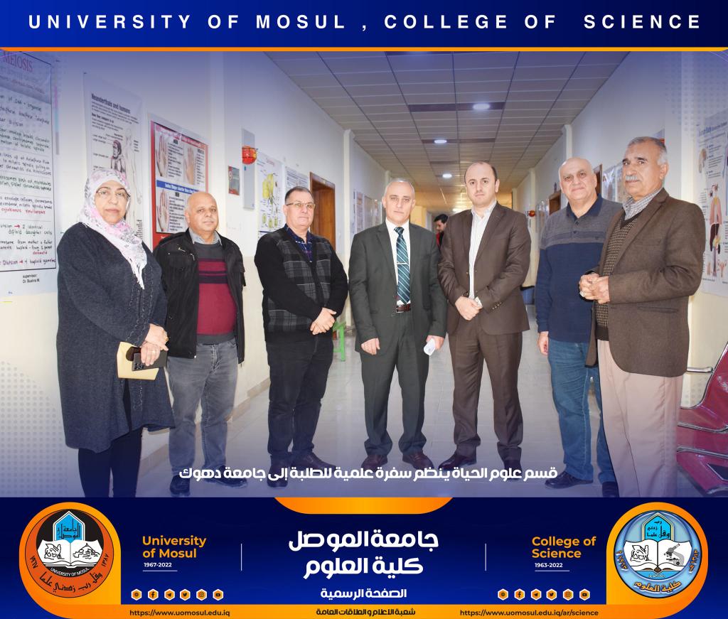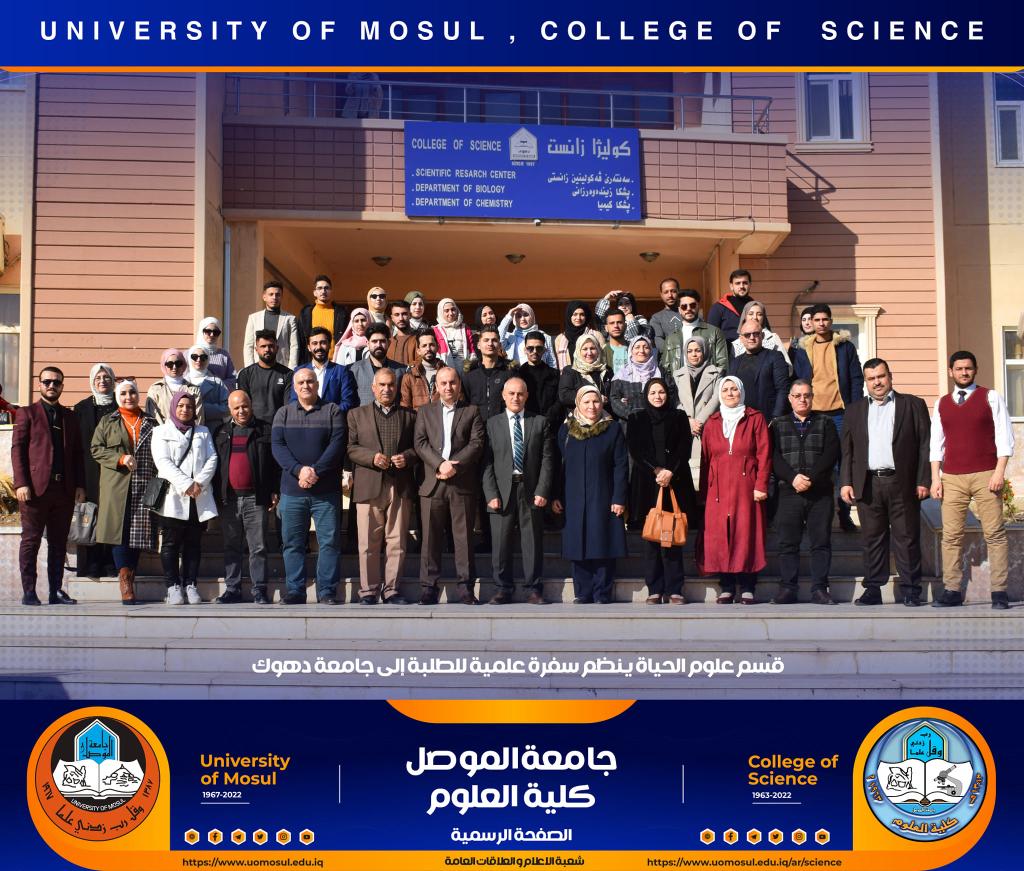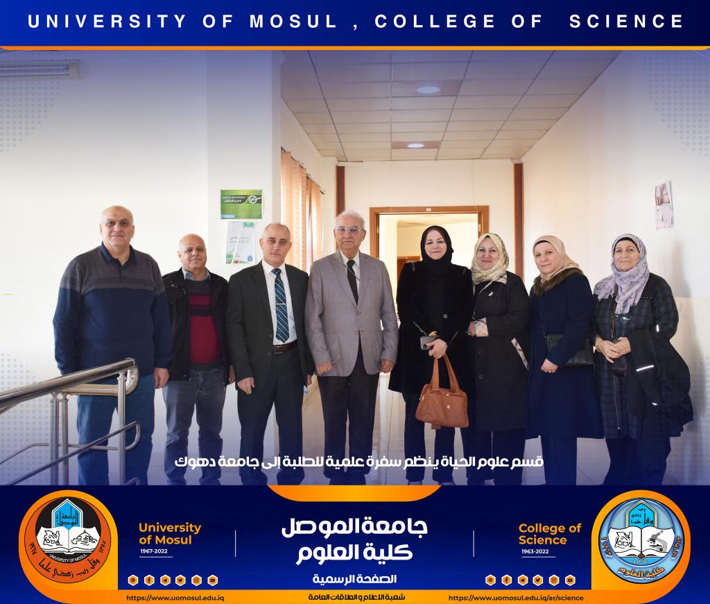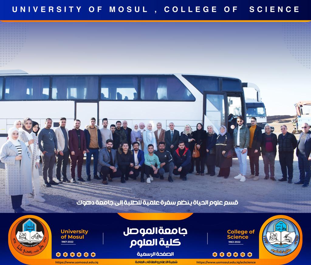 تنفيذاً لتوجيهات السيدة عميد كلية العلوم الاستاذ الدكتورة هيام عادل إبراهيم ، أقامت وحدة الارشاد في قسم علوم الحياة سفرة علمية لطلبته من مختلف المراحل الى محافظة و جامعة دهوك ، رافقهم خلالها السيد مقرر القسم و عدد من تدريسي القسم.هدفت الزيارة الى التواصل بين الجامعات والكليات العراقية ولتعريف طلبة القسم بالتقنيات العلمية والمختبرية المتوفرة في الكليات والاقسام المناظرة.كان في استقبال وفدنا الزائر السيد رئيس قسم علوم الحياة في جامعة دهوك وعدد من تدريسي القسم الذين أشادوا بمكانة كلية العلوم وجامعة الموصل بما تحظى به من قامات علمية وأكاديمية ، كما قدّم الوفد الزائر صورة واضحة عن التطور اللافت والنهضة التي شهدتها جامعتنا وأقسام الكلية بعد تحرير المدينة من العصابات الارهابية.في ختام الزيارة عبّر الوفد عن عظيم امتنانه وتقديره لحسن الاستقبال و التعاون المثمر البنّاء.شعبة الإعلام والعلاقات العامةالأربعاء 14 كانون الأول 2022