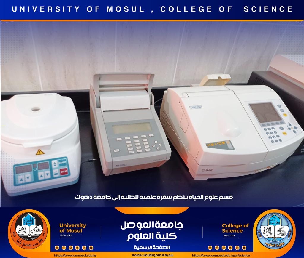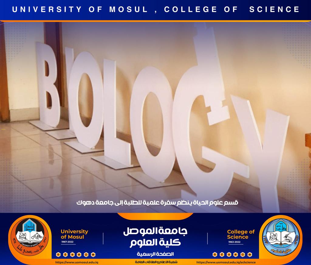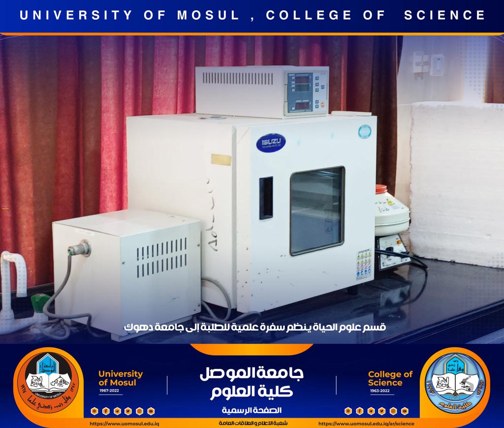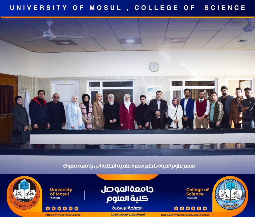 تنفيذاً لتوجيهات السيدة عميد كلية العلوم الاستاذ الدكتورة هيام عادل إبراهيم ، أقامت وحدة الارشاد في قسم علوم الحياة سفرة علمية لطلبته من مختلف المراحل الى محافظة و جامعة دهوك ، رافقهم خلالها السيد مقرر القسم و عدد من تدريسي القسم.هدفت الزيارة الى التواصل بين الجامعات والكليات العراقية ولتعريف طلبة القسم بالتقنيات العلمية والمختبرية المتوفرة في الكليات والاقسام المناظرة.كان في استقبال وفدنا الزائر السيد رئيس قسم علوم الحياة في جامعة دهوك وعدد من تدريسي القسم الذين أشادوا بمكانة كلية العلوم وجامعة الموصل بما تحظى به من قامات علمية وأكاديمية ، كما قدّم الوفد الزائر صورة واضحة عن التطور اللافت والنهضة التي شهدتها جامعتنا وأقسام الكلية بعد تحرير المدينة من العصابات الارهابية.في ختام الزيارة عبّر الوفد عن عظيم امتنانه وتقديره لحسن الاستقبال و التعاون المثمر البنّاء.شعبة الإعلام والعلاقات العامةالأربعاء 14 كانون الأول 2022