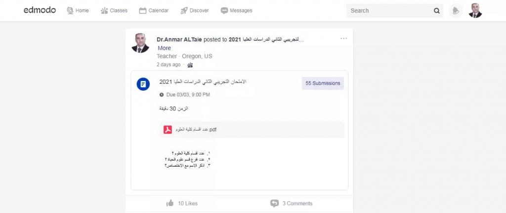 برعاية السيدة عميد كلية العلوم الأستاذ المساعد الدكتورة هيام عادل الطائي ، تم إجراء الامتحان التجريبي لطلبة الدراسات العليا في يوم الثلاثاء الموافق 2 آذار 2021 و بحضور السيد رئيس القسم الاستاذ المساعد الدكتور رائد سالم الصفار و اللجنة الإمتحانية في القسم حيث تم تدريب الطلبة من قبل الأستاذ المساعد الدكتور أنمار الطائي للوقوف على المشاكل التي قد تواجههم في الإمتحان و وضع الحلول لها وتفعيل الإيميلات الخاصة بالطلبة و تفعيلها على برنامج الأودمودو و بيان كيفية إجابة الأسئلة و تأكيد إرسال الإجابة حيث تم إجراء اختبار أولي في اليوم الأول و إجراء اختبار آخر في اليوم الثاني استعداداً للإمتحان النهائي في حاله كونه إلكترونياً .مع تمنياتنا لطلبتنا الأعزاء بالموفقية .