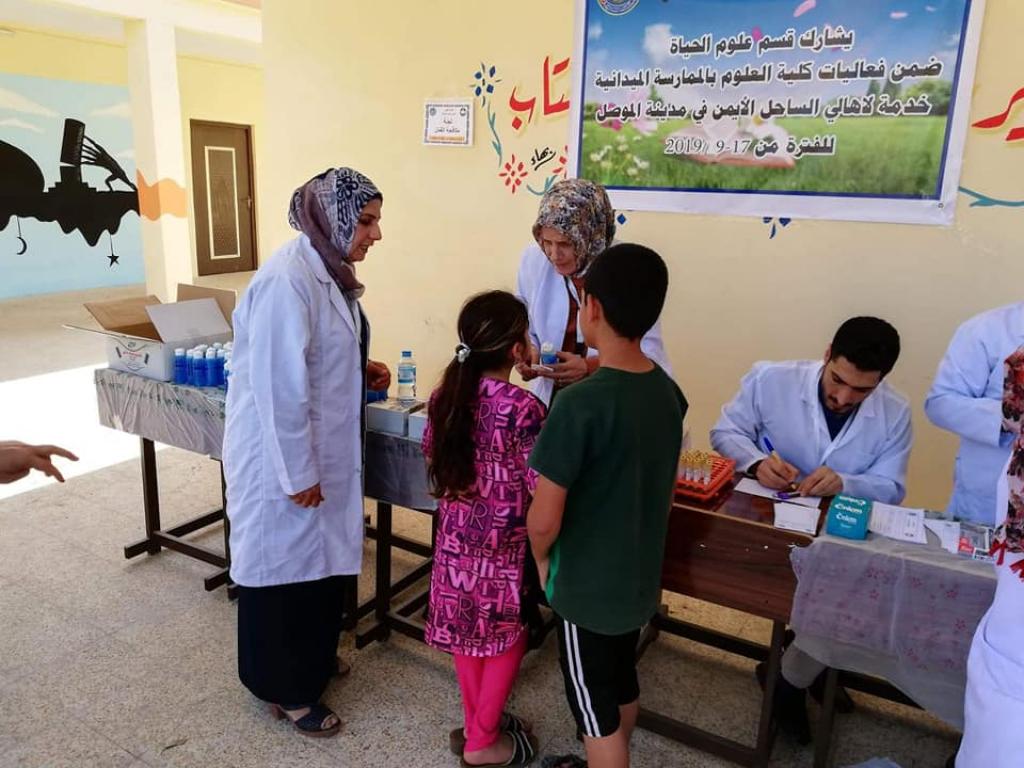 برعاية الاستاذ الدكتور قصي كمال الدين الاحمدي رئيس جامعة الموصل وباشراف السيد عميد كلية العلوم المحترم الاستاذ الدكتور انور مصطفى عزت الفيضي، شارك قسم علوم الحياة في فعاليات الممارسة الميدانية لكلية العلوم خدمة لاهالي الساحل الايمن في منطقة الشفاء وتحت شعار “الجامعة في خدمة المجتمع” للفترة من 17-19/9/2019 ممثلاً برئيسه الاستاذ الدكتور نديم احمد رمضان ومقرر القسم الدكتور رائد سالم الصفار وعدد من تدريسي وموظفي وطلبة القسم، تمثلت مشاركة قسم علوم الحياة بتقديم خدمات منوعة للاهالي، كاجراء مختلف الفحوصات الدموية، واجراء فحص القمل للاطفال المصابين به مع تقديم العلاج لهم، كما تم اجراء مسح ميداني للمياه المتوفرة في المنطقة للتاكد من سلامتها للاستخدام، واجري ايضا فحص جرثومي للاغذية للتاكد من خلوها من الانواع البكتيرية او الجراثيم المختلفة، اجري ايضا مسح للتنوع الاحيائي لبعض الاماكن في المنطقة، وفي نهاية الحملة قام منتسبوا القسم وطلبته باجراء حملة تنظيف لمكان العمل
