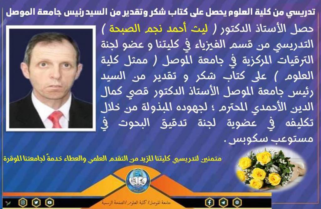لطالما سعت كلية العلوم جاهدة في رفد وديمومة المسيرة العلمية لمنتسبيها و خريجيها وطلبتها الراغبين في التقديم للدراسات العليا في الكلية ، و ها هي اليوم تحقق تقدماً جديداً يضاف الى سلسلة حركتها في دعم المسيرة العلمية ، فبدعم متواصل من السيد رئيس جامعة الموصل الأستاذ الدكتور قصي كمال الدين الأحمدي المحترم ، و بمتابعة وجهد مثمر من السيدة العميد الأستاذ المساعد الدكتورة هيام عادل إبراهيم ، والسيد رئيس قسم الكيمياء الدكتور سالم جاسم المحترم اضافة الى السيدة رئيس فرع الكيمياء الحياتية في قسم الكيمياء الأستاذ الدكتورة ذكرى على علوش و اللجان العلمية المتخصصة في القسم ، تعلن كلية العلوم عن إعادة فتح بعض التخصصات العلمية في قسم الكيمياء للعام الدراسي 2022-2023. حيث بالإمكان التقديم عليها بدأ من العام الدراسي المذكور.هذا وتتقدم السيدة العميد المحترمة بجميل عبارات التهنئة لجميع الخريجين الراغبين في التقديم للدراسات العليا في الكلية ، كما تثمن السيدة العميد الجهود المتميزة للسيد مدير الدراسات العليا في رئاسة الجامعة الدكتور عمر مظفر ، والسيدة مديرة الدراسات العليا في الكلية الدكتورة سيناء عبد الله علي.مع أمنياتنا للجميع بمستقبل مشرق يزهو بالتقدم والرقي .