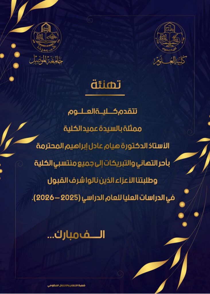 تتقدم كلية العلوم متمثلة بالسيدة عميد الكلية الأستاذ الدكتورة هيام عادل إبراهيم بالعزاء للأمة الإسلامية والشعب العراقي بذكرى أربعينية الإمام الحسين (عليه السلام)، الذي قدم أروع صور التضحية في سبيل الحق والعدل.