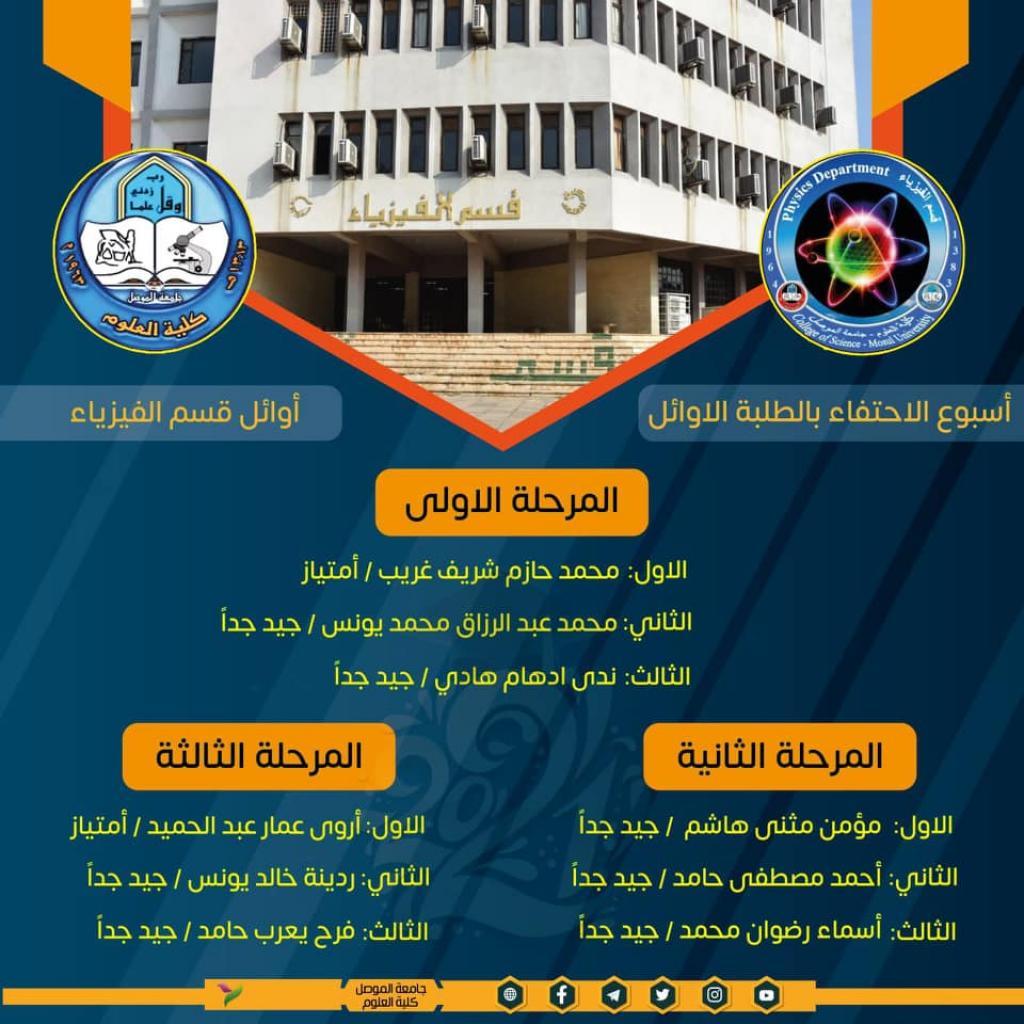 ضمن مبادرة أسبوع الاحتفاء بالطلبة الأوائل في كلية العلوم ، وبناءً على توجيهات السيدة العميد الأستاذ المساعد الدكتورة هيام عادل الطائي المحترمة ، تعلن كلية العلوم عن الطلبة الثلاثة الأوائل على المراحل الأولى والثانية والثالثة للعام الدراسي 2020-2021، مع كامل تمنياتنا لطلبتنا المتفوقون ولجميع طلبتنا الأعزاء بالتوفيق والنجاح.اعداد وتنفيذ :م. م. يونس ابراهيم محمد عليمدير شعبة التسجيل