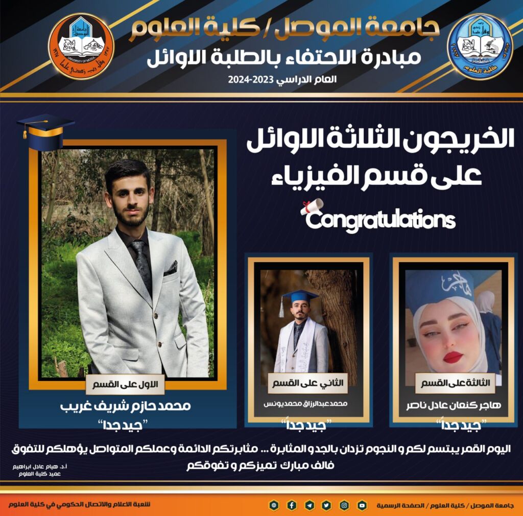 وبهذه المناسبة تتقدم أسرة كلية العلوم متمثلةً بالسيدة العميد الأستاذ الدكتورة (هيام عادل إبراهيم الطائي) المحترمة، بأجمل عبارات التهاني والتبريكات لطلبتنا المتفوقين والناجحين، متمنيةً لهم دوام النجاح والتفوق والعطاء.
