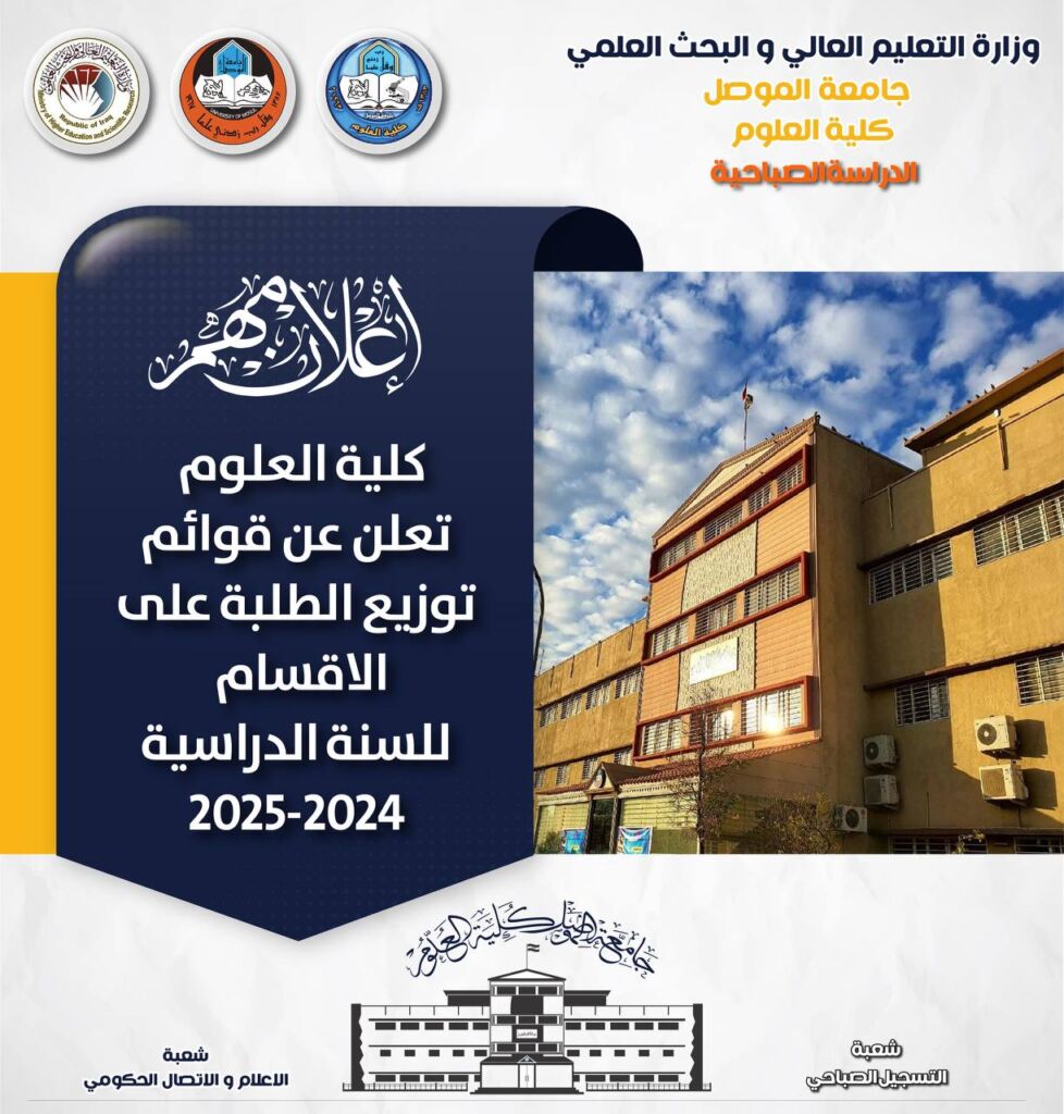 كلية العلوم تعلن عن قوائم توزيع الطلبة المقبولين مركزياً ، ذوي الشهداء، وقوائم تعديل الترشيح