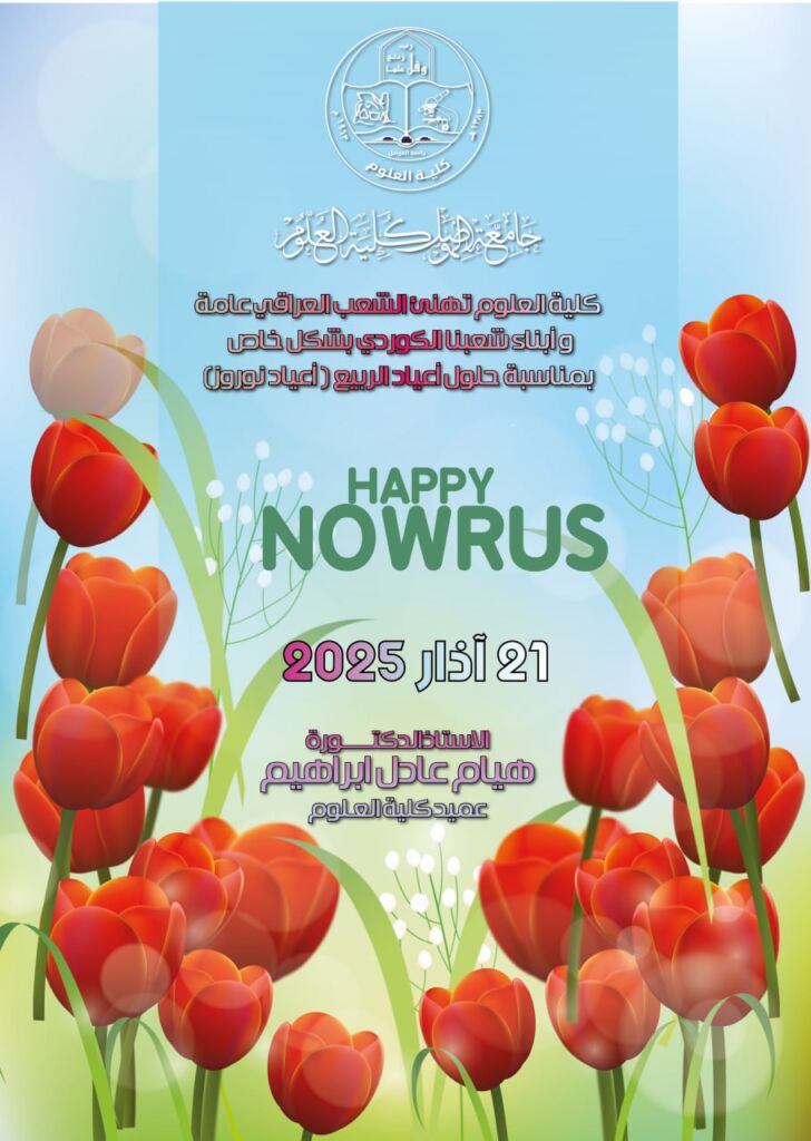 تتقَـدَّمُ كُلِّيَّـــةُ العلـومِ مُتمَثِّلــةً بالسَّيِّــدة العميـد الأستـاذ الدكتـورة هِيـام عـادِل إبراهيـم الطائـي المُحتـرمــة بكُــلِّ حُـبٍّ وإجـلالٍ بألطـف التَّهانـي والامتِنــانِ لكُـلِّ أُمٍّ حَمَلَـتْ وأنجَبَـتْ ورَبَّـتْ ورَبَّتَـتْ وأنشَـأتْ أجيـالاً علـى كُـلِّ يـومٍ يُشرِقـنَ بـهِ علينـا ويُنِـرنَ بـهِ حياتَنـا في عيدِهِـنَّ العَرَبِـيِّ البَهـيِّ