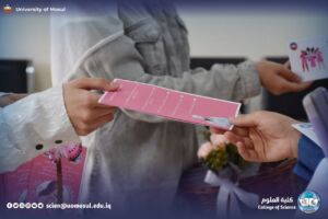 برعاية السيد رئيس جامعة الموصل الأستاذ الدكتور وحيد محمود الإبراهيمي المحترم، وبإشراف السيدة عميد كلية العلوم الأستاذ الدكتورة هيام عادل إبراهيم المحترمة، أقامت لجنة شؤون المرأة في كليَّتِنـا، وبالتعاون مع رئاسة الجامعة / قسم الدراسات والتخطيط – وحدة التنمية المستدامة ووحدة شؤون المرأة، ووحدة النشاطات الطلابية في كلية العلوم، نشاطاً توعوياً يوم الأربعاء الموافق 22 تشرين الأول 2025 تمثّل بتوزيع بروشورات تثقيفية ضمن الحملة التوعوية للكشف المبكر عن سرطان الثدي تحت شعار: “صحتكِ بين يديك.. بادري بالفحص الذاتي”.