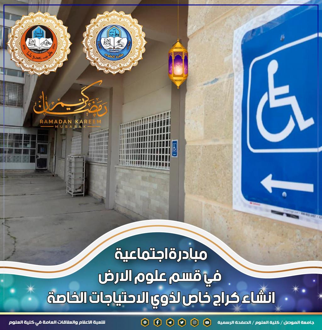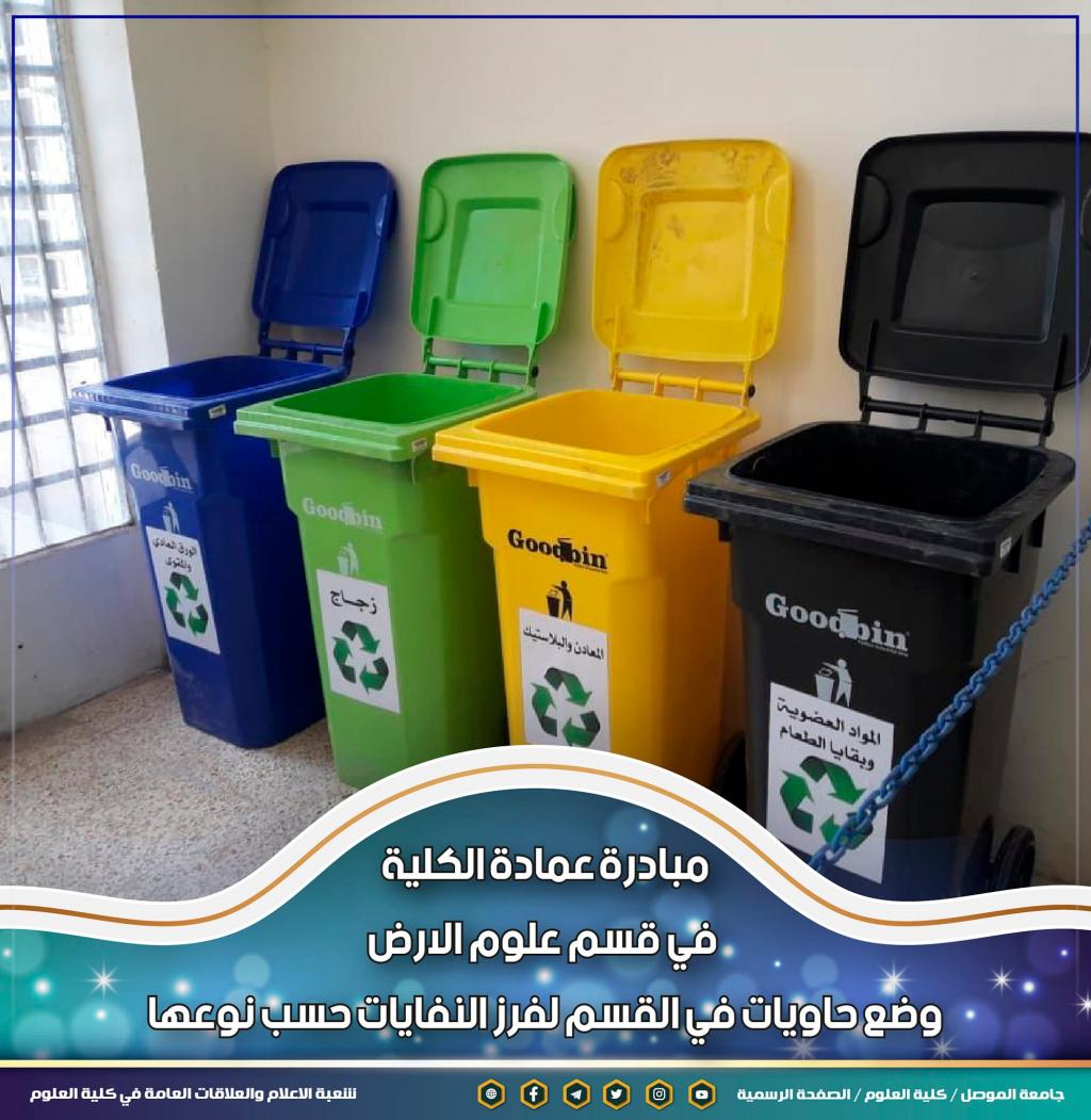 تنفيذاً لتوجيهات السيدة عميد كلية العلوم الأستاذ الدكتورة هيام عادل إبراهيم وبإشراف مباشر من السيد رئيس قسم علوم الأرض الأستاذ الدكتور زيد عبدالوهاب ملك ، تم إنشاء موقف خاص لذوي الاحتياجات الخاصة قرب القسم مع وضع العلامات الإرشادية اللازمة وذلك لتسهيل دخول السادة المستفيدين إلى القسم بسهولة ودون أي صعوبة.كما تم كذلك وضع حاويات خاصة بدعم عمادة الكلية تشجيعاً للتنمية المستدامة واعادة التدوير، من خلال فرز النفايات عن بعضها حسب نوعية المواد المطروحة من زجاج و بلاستيك وغيرها وذلك للاستفادة منها في تدوير النفايات وجعلها صديقة للبيئة في الوقت ذاته .