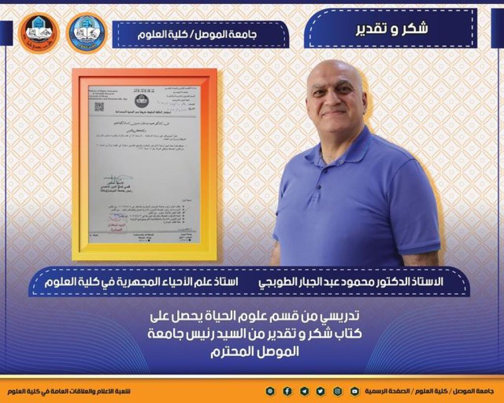 تدريسي من كليتنا يحصل على كتاب شكر وتقدير من السيد رئيس جامعة الموصل