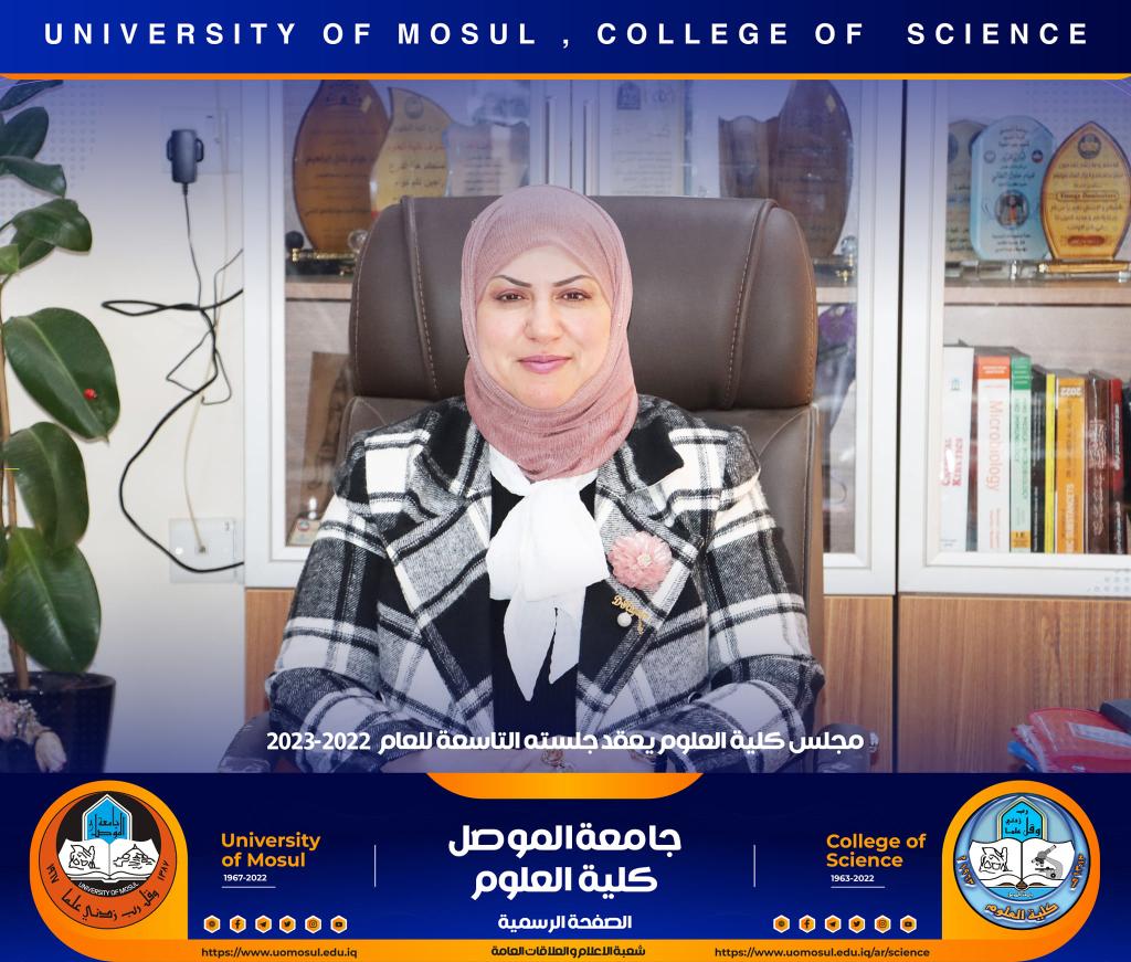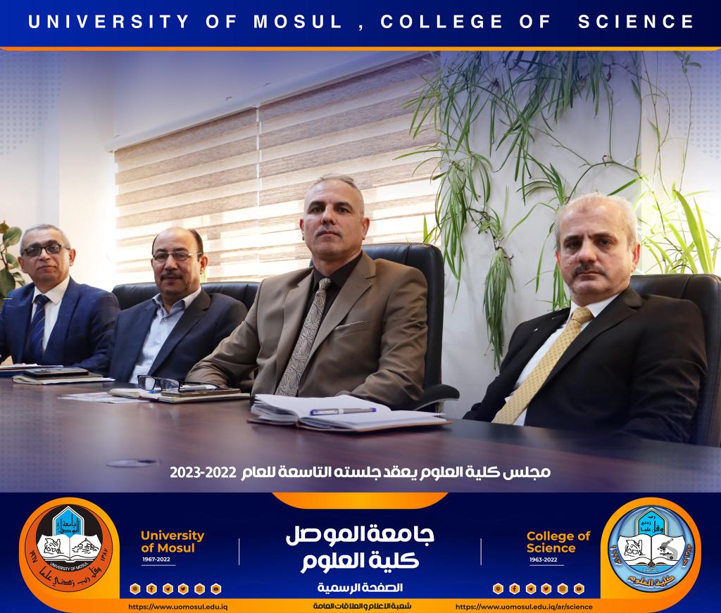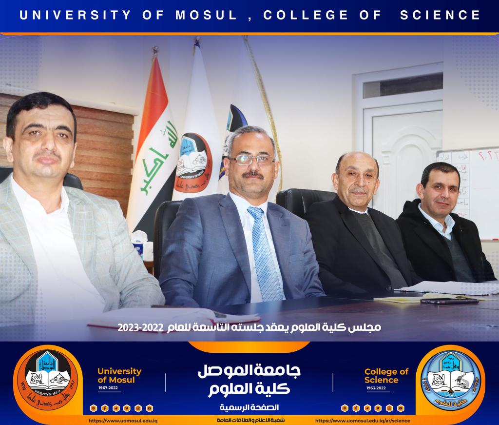 عقد مجلس كلية العلوم جلسته التاسعة للعام الدراسي 2022-2023 يوم الأحد الموافق 18 كانون الأول 2022 برئاسة السيدة عميد الكلية الأستاذ الدكتورة هيام عادل إبراهيم و عضوية السادة معاوني العميد و السادة رؤساء الأقسام.ناقش المجلس تقارير التقييم الذاتي لأقسام الكلية ، و الامتحانات النهائية لطلبة الدراسات العليا ، كما ناقش التحضيرات النهائية لحفل الطلبة الأوائل و حفل استقبال طلبة المرحلة الأولى ، نوقشت كذلك عديد من الأعمال الأخرى المدرجة ضمن جدول الأعمال.شعبة الإعلام و العلاقات العامةالأحد 18 كانون الأول 2022
