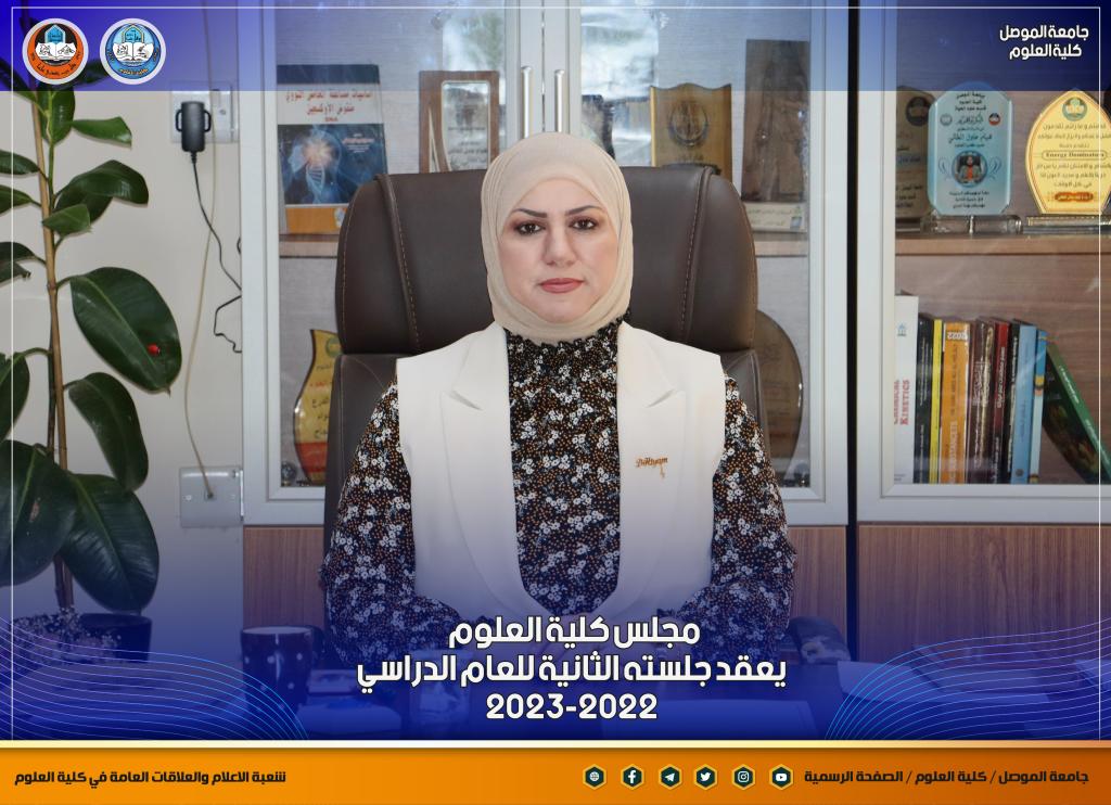 عقد مجلس كلية العلوم جلسته الثانية للعام الدراسي 2022-2023 يوم الاربعاء الموافق 21 أيلول 2022 برئاسة السيدة عميد الكلية الأستاذ الدكتورة هيام عادل إبراهيم و عضوية السادة معاوني العميد و السادة رؤساء الأقسام و ممثل نقابة الاكاديميين العراقيين، و السيدة مديرة الدراسات العليا في الكلية.