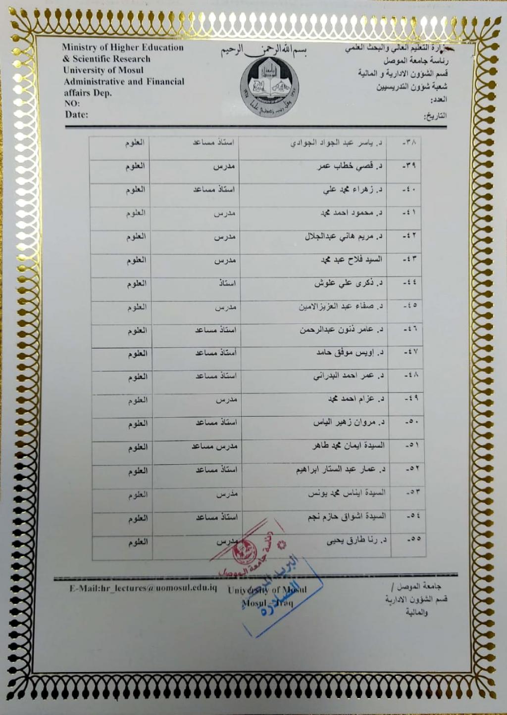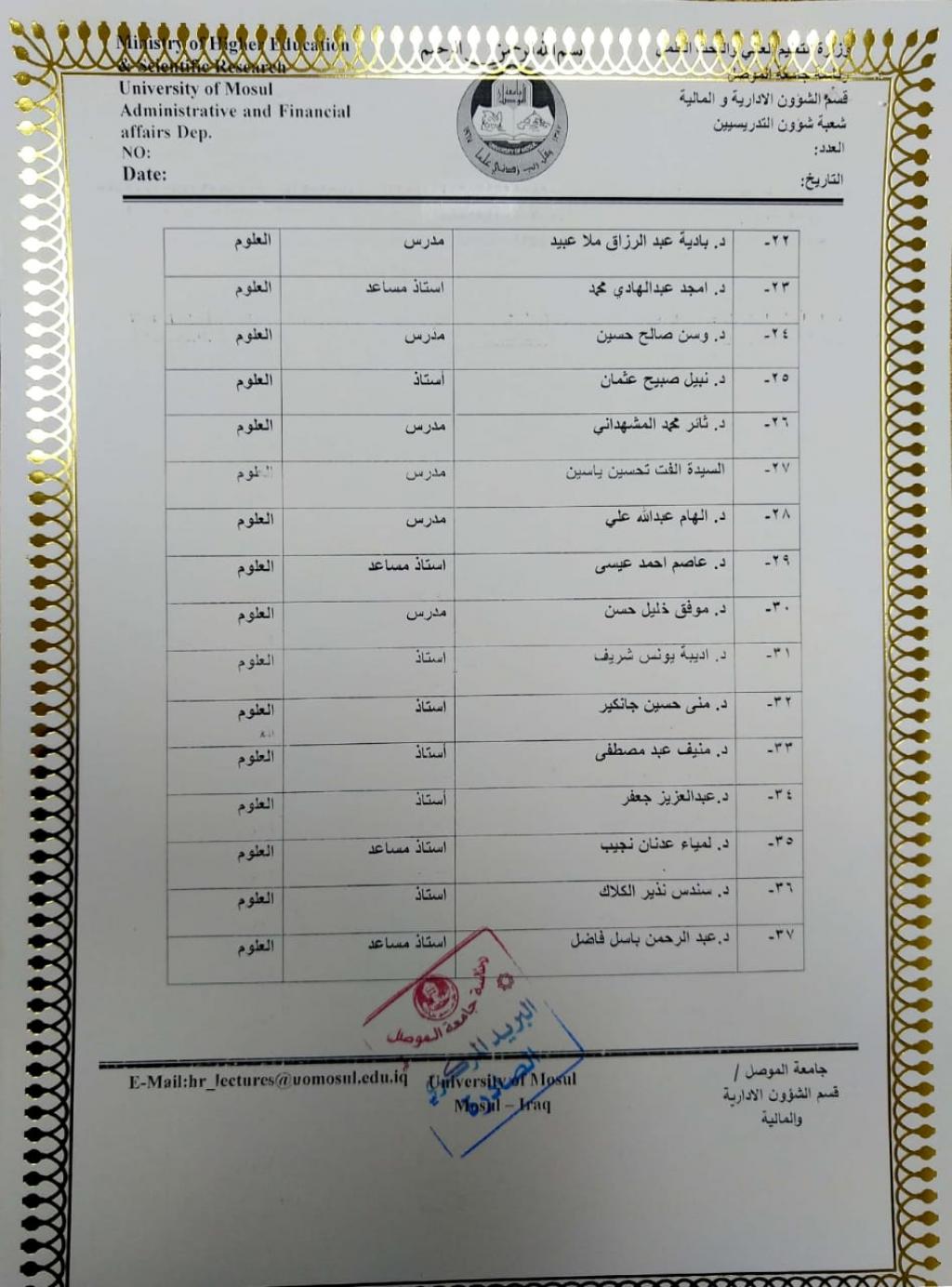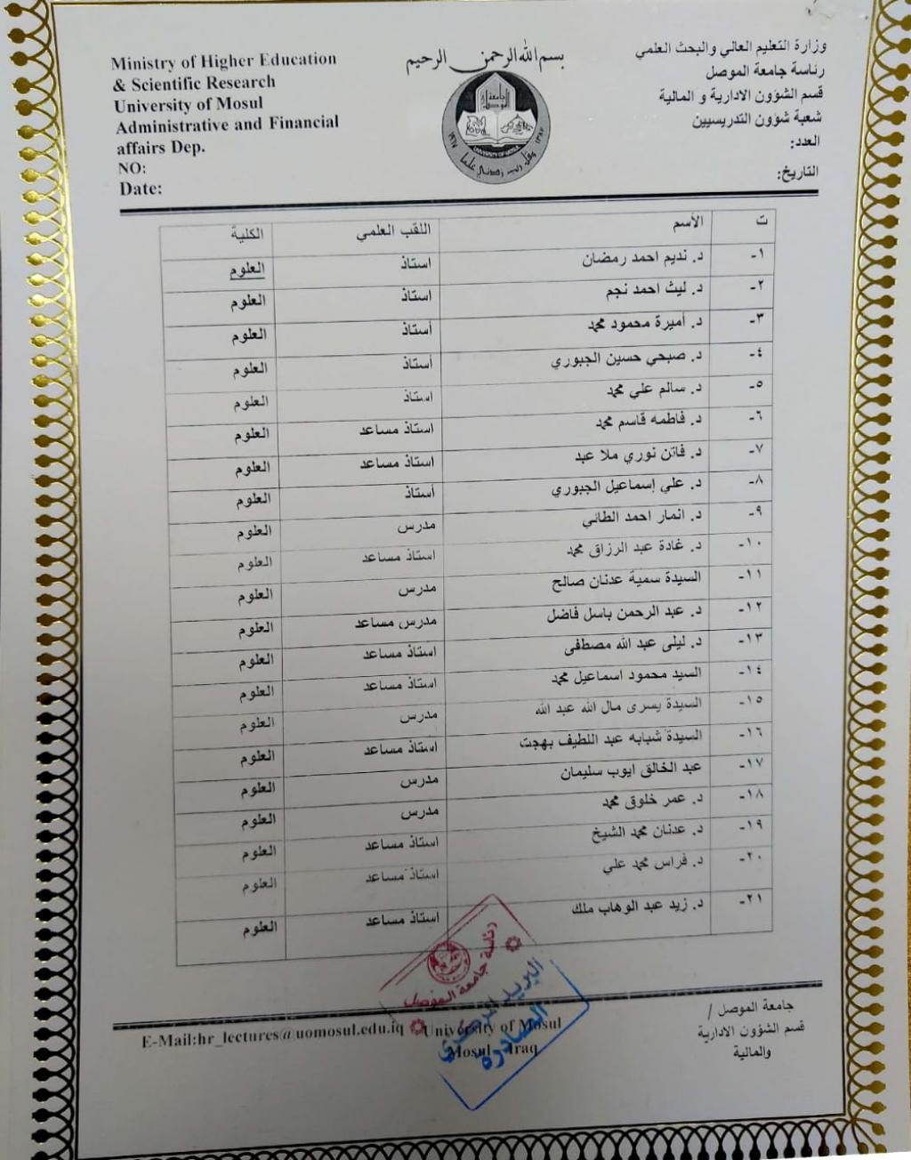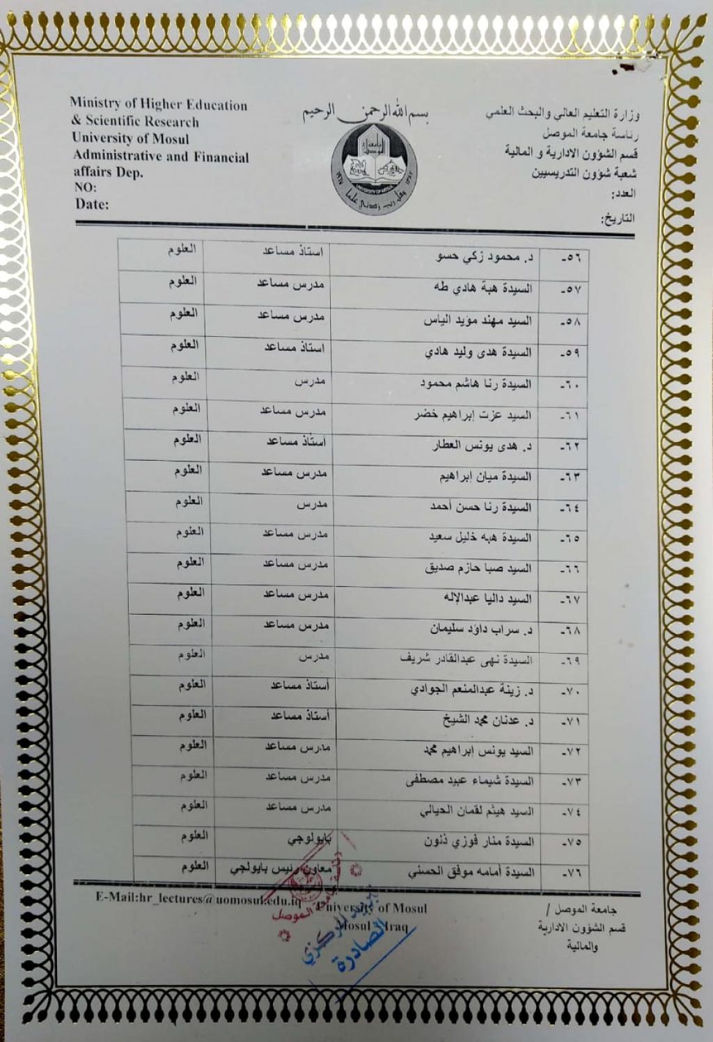 مجموعة من تدرسييي كلية العلوم يحصلون على كتاب شكر و تقدير من السيد رئيس جامعة الموصل