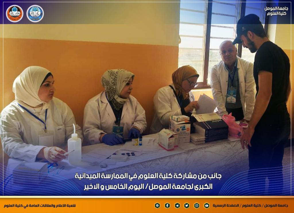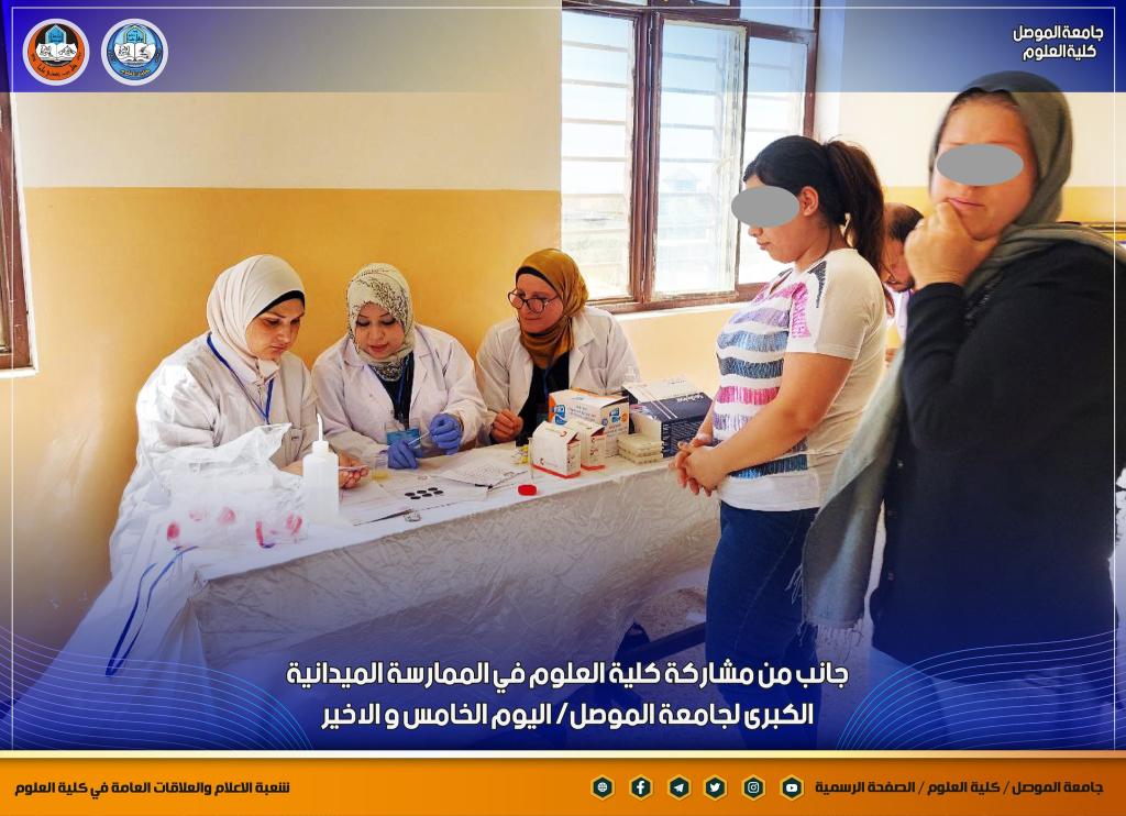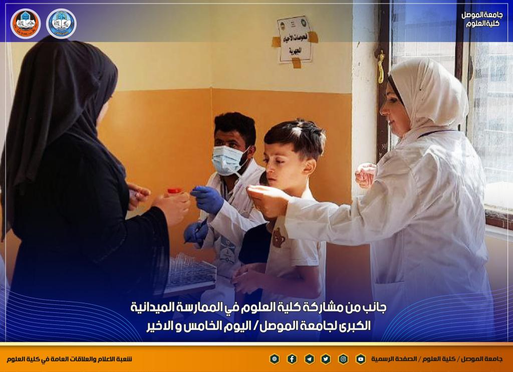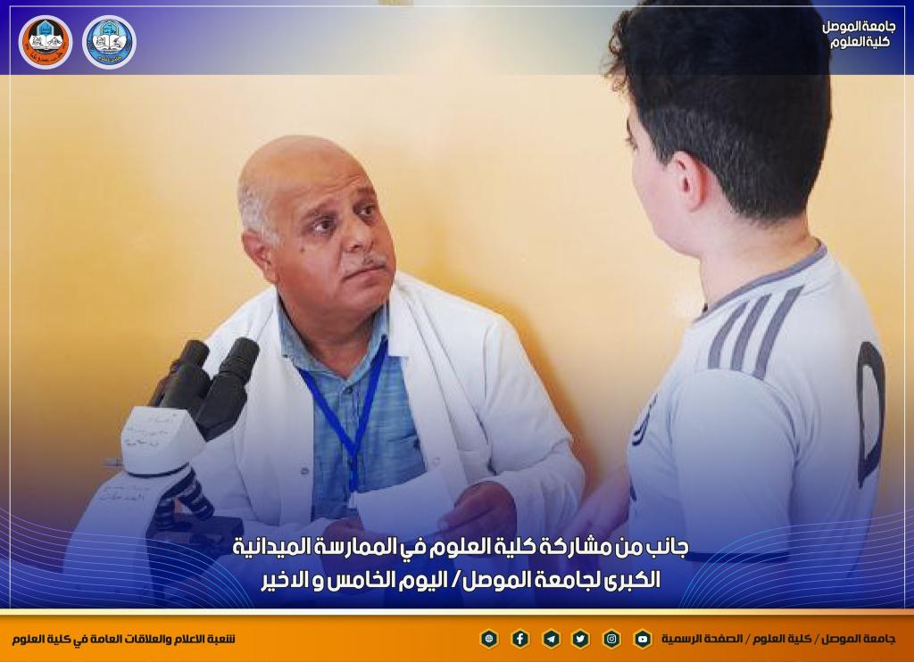 اليوم الخامس و الأخير :الخميس 29 أيلول 2022اقبال مستمر و مكثف على مختبر كلية العلوم في الممارسة الميدانية لإجراء الفحوصات المختبرية المجانية ، جدير بالذكر أن عدد الفحوصات المجانية التي قدمها المختبر بلغ 497 فحصاً منوعاً خلال فترة الممارسة بتواجد كادر متخصص من تدريسي و طلبة الكلية.جامعة الموصل في خدمة المجتمع… كلية العلوم في خدمة المجتمع…تمنياتنا للجميع بموفور الصحة و العافية.شعبة الإعلام والعلاقات العامةالخميس 29 أيلول 2022