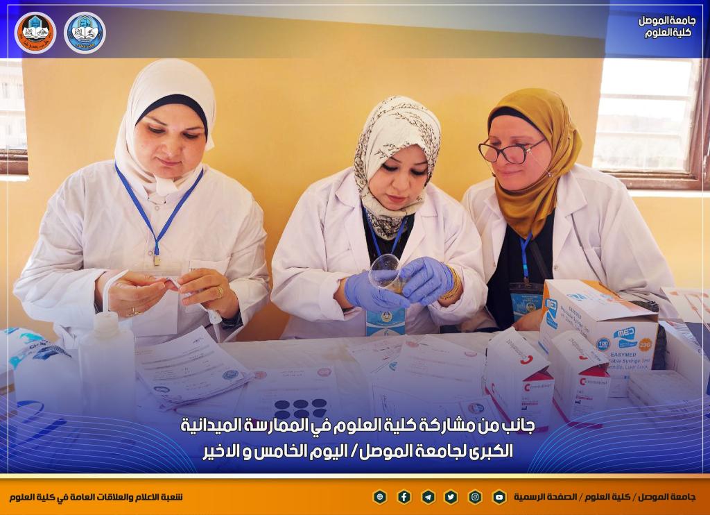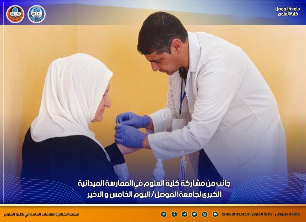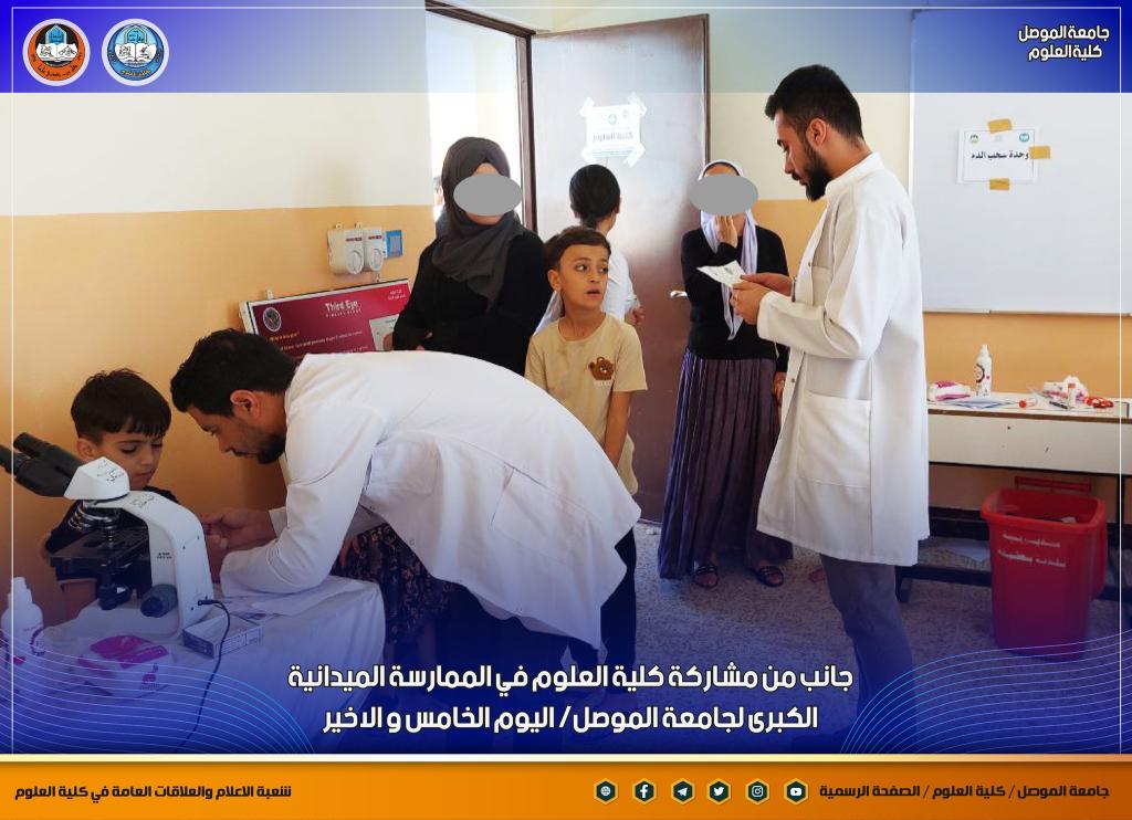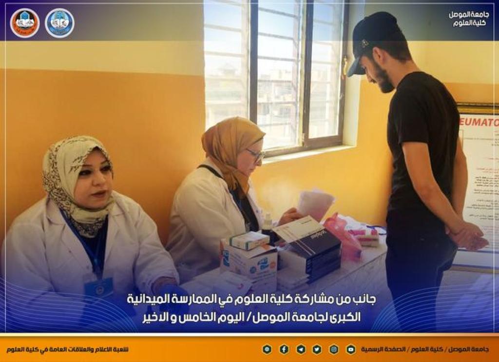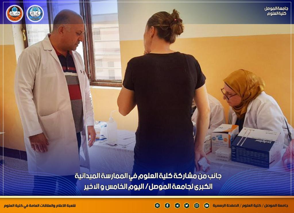 اليوم الخامس و الأخير :الخميس 29 أيلول 2022اقبال مستمر و مكثف على مختبر كلية العلوم في الممارسة الميدانية لإجراء الفحوصات المختبرية المجانية ، جدير بالذكر أن عدد الفحوصات المجانية التي قدمها المختبر بلغ 497 فحصاً منوعاً خلال فترة الممارسة بتواجد كادر متخصص من تدريسي و طلبة الكلية.جامعة الموصل في خدمة المجتمع… كلية العلوم في خدمة المجتمع…تمنياتنا للجميع بموفور الصحة و العافية.شعبة الإعلام والعلاقات العامةالخميس 29 أيلول 2022