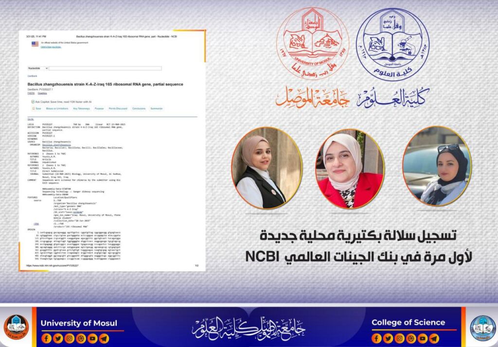 ضمن مشهد الانجازات العلمية لتدريسي كلية العلوم، سجل كل من المدرس الدكتور محمد مهدي صالح التدريسي في قسم علوم الحياة، وطالبي البكالوريوس نسرين باسل بشير وعبد الرحمن علي يونس سلالة بكتيرية محلية جديدة تعود لنوع Prevotella melaninogenica لأول مرة في المركز الوطني لمعلومات التقانة الحيوية NCBI بالرمز MoNbAa والمعزولة من تجويف الفم ضمن مشروع تخرج الطلبة. علما ان هذه البكتيريا تعزل وتشخص لأول مرة على مستوى القطر وتعتبر من الأنواع اللاهوائية صعبة العزل والتشخيص.