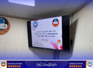 “تأثير التطفير الفيزيائي على إنتاج إنزيم L-Asparagenase من بعض الخمائر المعزولة محليًا ودراسة بعض تطبيقاته الحيوية“، بإشراف أ.د. أمجد عبد الهادي محمد، وأ.م.د. بادية عبد الرزاق ملا عبيدة. - قدّم طالب الدكتوراه محمود نافع محمود شهاب حلقة دراسية عن أطروحته الموسومة: