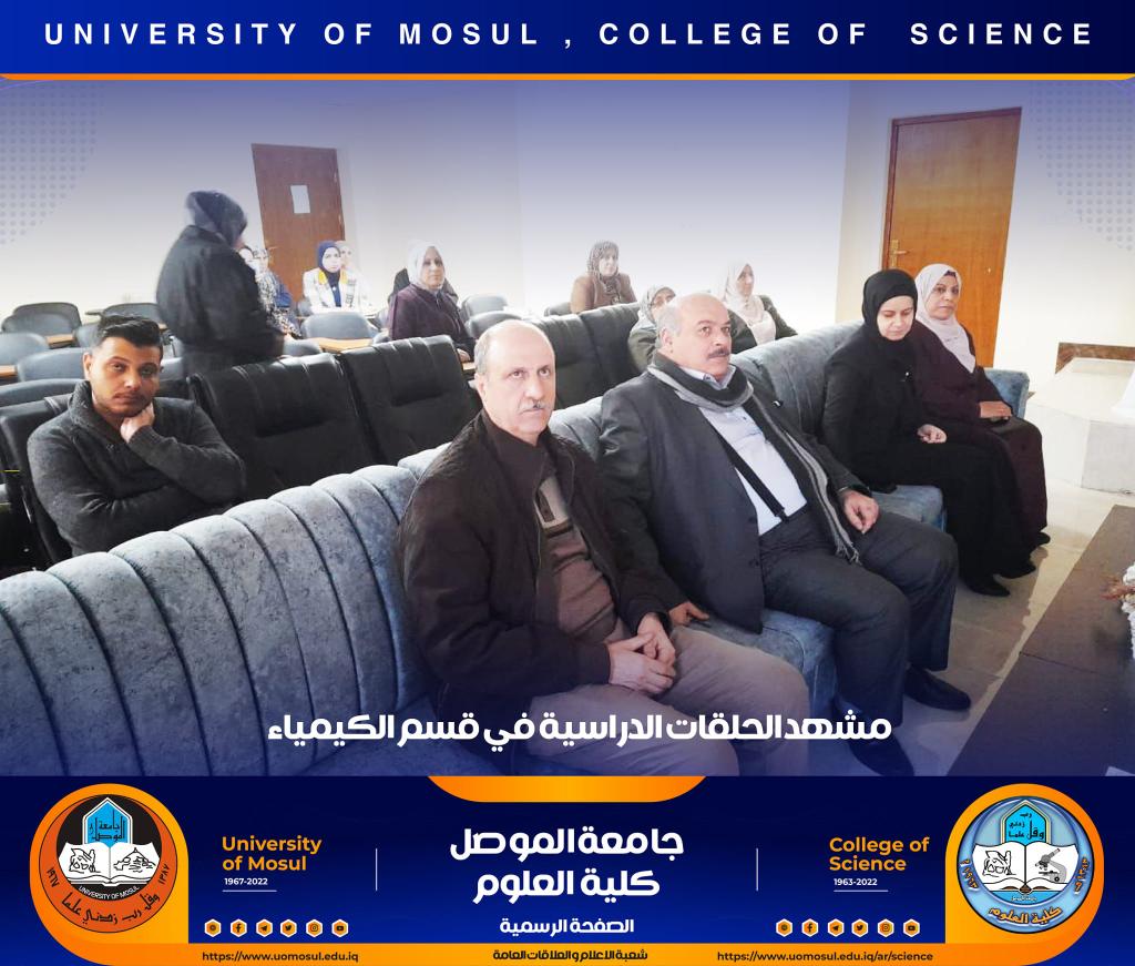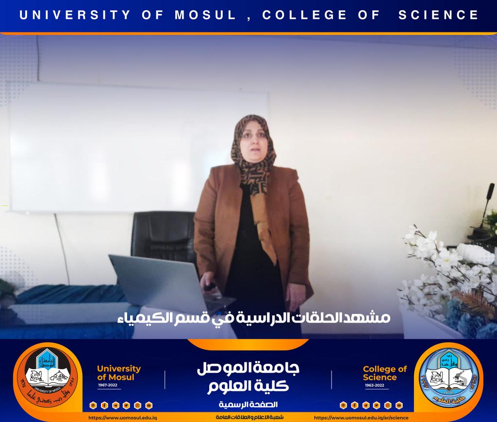 ضمن مشهد الحلقات الدراسية في قسم الكيمياء القى كل من:1- طالبة الدكتوراه حنان حميد أحمد حلقة دراسية عن اطروحتها الموسومة”Development of spectrophotometric methods for the determination of Phenylephrine in the bulk and in its pharmaceutical preparations”بإشراف الأستاذ الدكتور سالم علي محمد.2- طالبة الدكتوراه ولادة حميد إبراهيم حلقة دراسية عن اطروحتها الموسومة”Spectrophotometric and HPLC methods for quantification of Remdesivirin pharmaceutical formulations”بإشراف الأستاذ المساعد الدكتورة هناء شكر محمود ، وذلك صباح يوم الإثنين الموافق 19 كانون الاول 2022.شعبة الإعلام والعلاقات العامةالجمعة 23 كانون الأول 2022