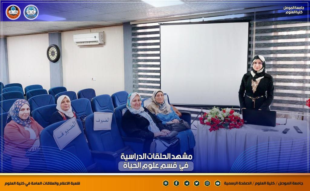 ضمن سلسلة الحلقات الدراسية في قسم علوم الحياة ، ألقت طالبة الدكتوراه (دعاء محمد يحيى ) حلقة دراسية عن أطروحتها الموسومة ” المؤشرات الكيموحيوية والجزيئية التشخيصية لبعض اضطرابات الهرمونات السترويدية ” بإشراف الأستاذ المساعد الدكتورة سراب داؤود سليمان و الأستاذ المساعد الدكتورة عفراء محمد محمود.وذلك صباح يوم الأربعاء الموافق 21 أيلول 2022 على قاعة الأستاذ الدكتور محمود الحاج قاسم بحضور السيد رئيس القسم و السيد مقرر القسم وعدد من تدريسي وطلبة الدراسات العليا في القسم.تمنياتنا للطالبة و مشرفيها بالتوفيق