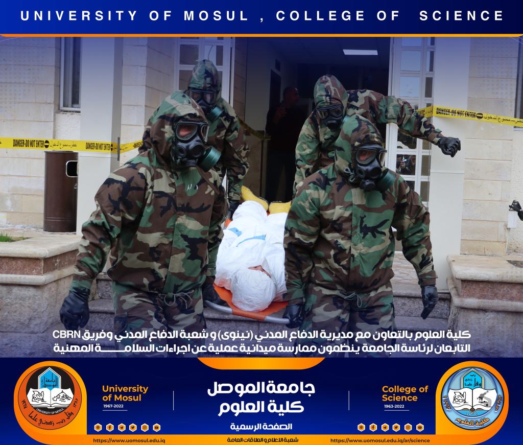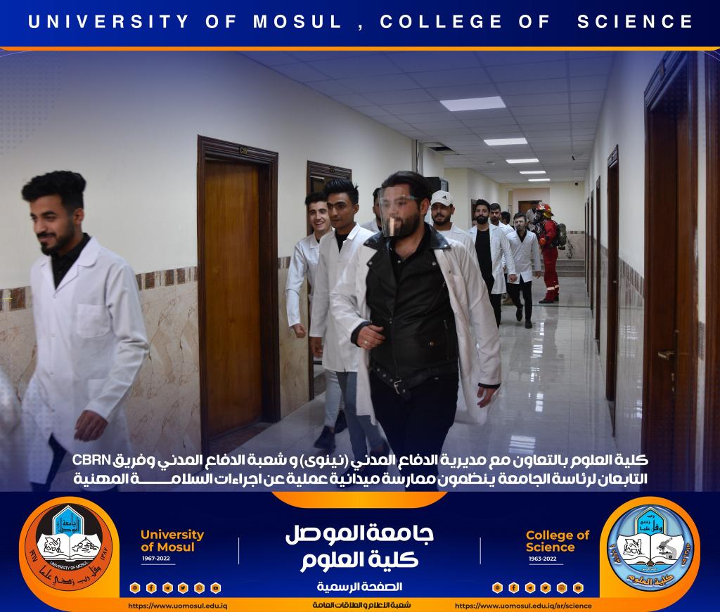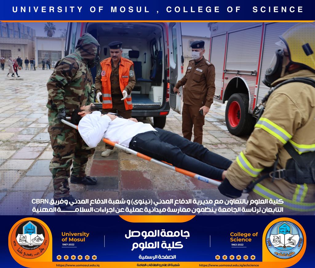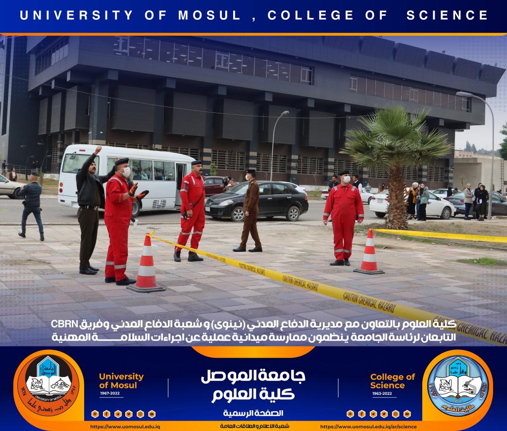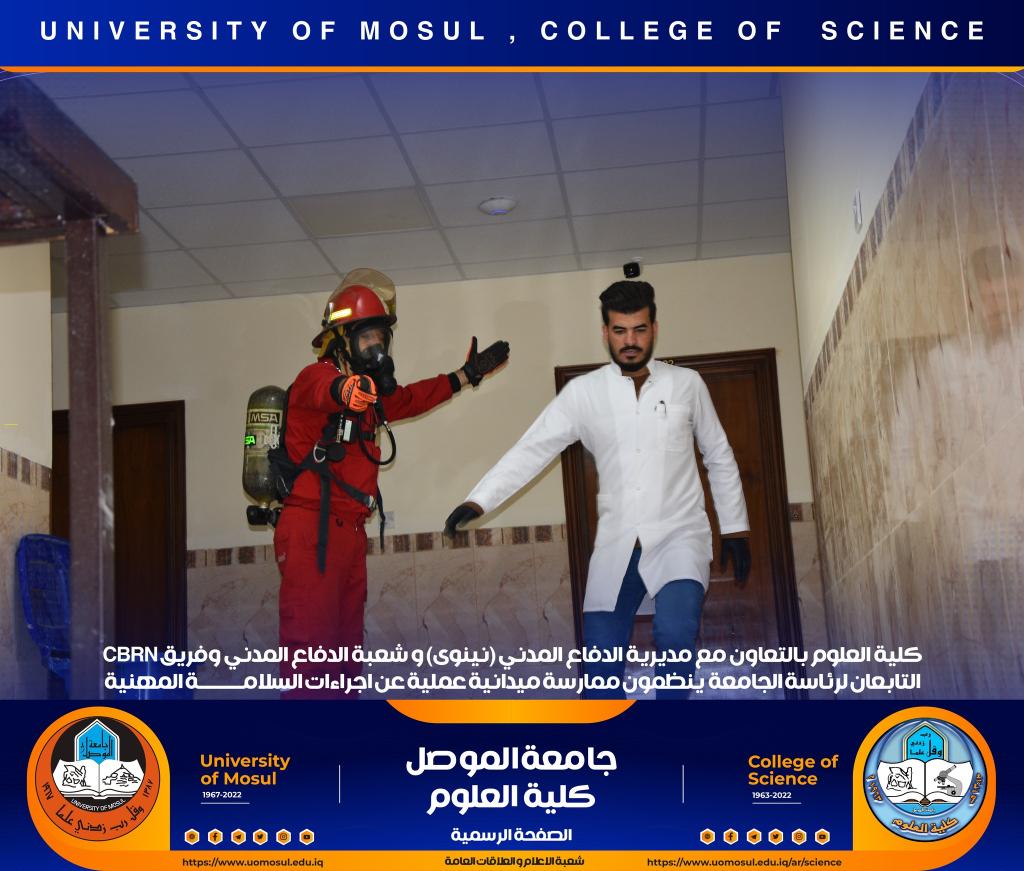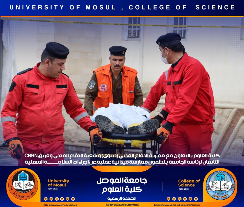 برعاية السيد رئيس جامعة الموصل الأستاذ الدكتور قصي كمال الدين الأحمدي، و بحضور السيد المساعد العلمي الاستاذ الدكتور منير سالم طه و السيد المساعد الاداري الاستاذ الدكتور وحيد محمود الابراهيمي وبإشراف وحضور السيدة عميد كلية العلوم الاستاذ الدكتورة هيام عادل ابراهيم، و مدير الدفاع المدني العقيد رائد عبد الله اللطيف والسيد مسؤول CBRN في الجامعة الدكتور مهند يقظان إضافة إلى السيد سفيان ادريس محمد مسؤول شعبة الدفاع المدني في الجامعة.جرت في كليتنا ممارسة ميدانية عملية عن اجراءات السلامة المهنية في المختبرات قام بها فريق مديرية الدفاع المدني / نينوى و شعبة الدفاع المدني و فريق CBRN التابعان لرئاسة جامعة الموصل صباح يوم الثلاثاء الموافق 13 كانون الأول 2022 في رحاب مختبرات قسم الكيمياء.هدفت الممارسة الى ترسيخ مفاهيم السلامة المهنية لدى المنتسبين و الطلبة من خلال اجراء مشاهد حية قامت بها فرق مختصة بكامل عُدَدِها من الجهات المشاركة عن كيفية التعامل مع الحرائق وانسكاب المواد الكيميائية في المختبرات، و ما هي الطرق المناسبة في التشخيص و التعامل و الوقاية من هذه المخاطر إضافة الى كيفية اخلاء الابنية دون التاثير وبث الذعر لدى المنتسبين و الطلبة الاخرين و كيفية اجراء الاسعافات الاولية للاصابات المحتملة للحيلولة دون تفاقمها.بدورها عبرت أسرة كلية العلوم ممثلة بعميدها بجزيل الشكر و خالص التقدير للأبطال من الفرق المشاركة في هذه الممارسة العملية القيمةالتي حضرها جمع غفير من منتسبي و طلبة الكلية و الجامعة و تاتي لتؤكد على أهمية التكاتف و التعاون المثمر بين دوائر و مؤسسات الدولة المختلفة في تطبيق اجراءات السلامة المهنية.لمشاهدة عرض فيديوي عن الممارسة العملية زيارة الموقع الرسمي لرئاسة جامعة الموصل على الرابط :https://fb.watch/honayqI1In/شعبة الإعلام والعلاقات العامةالثلاثاء 13 كانون الأول 2022
