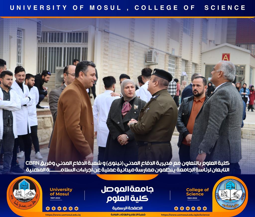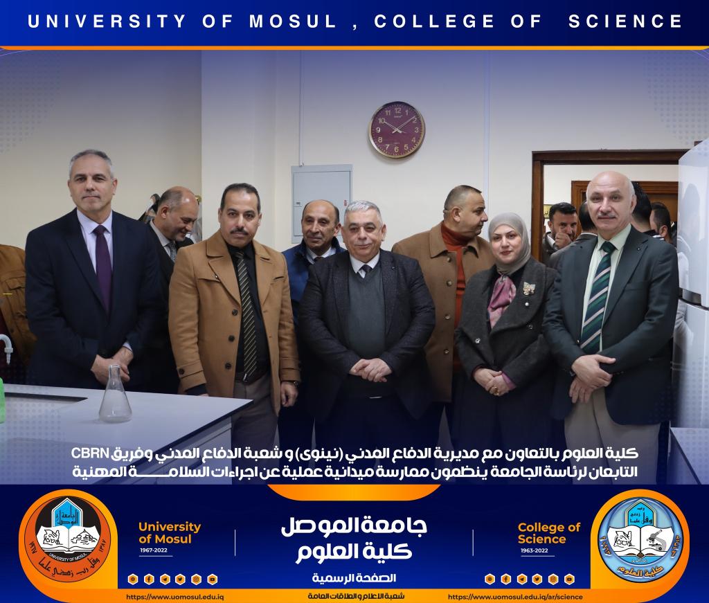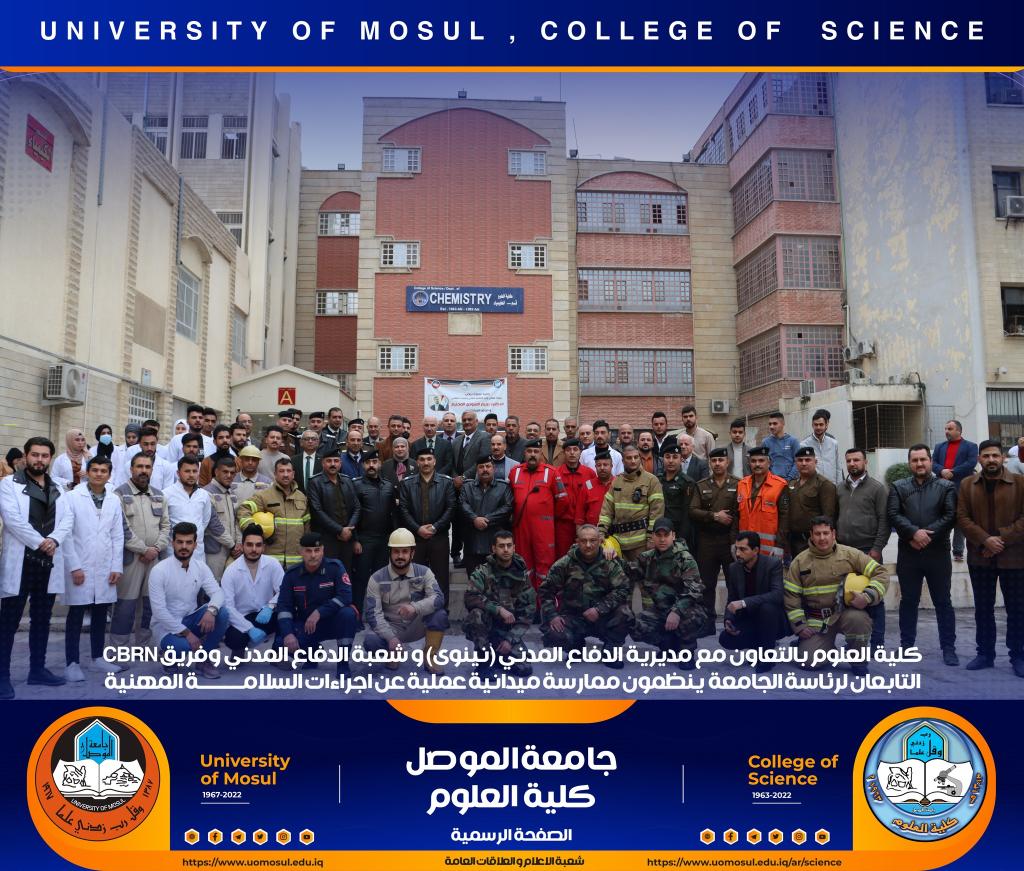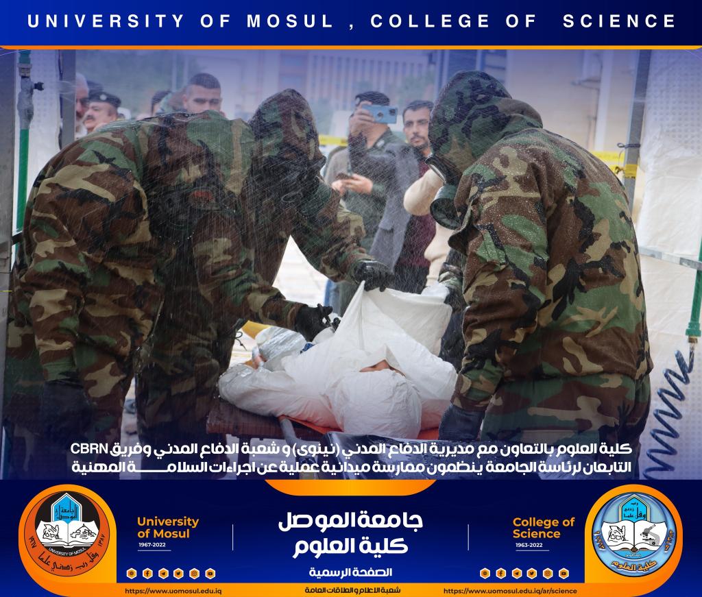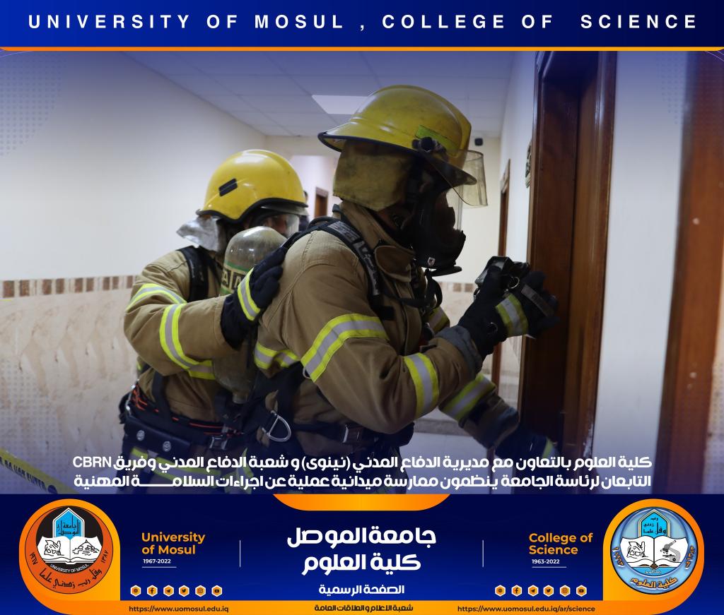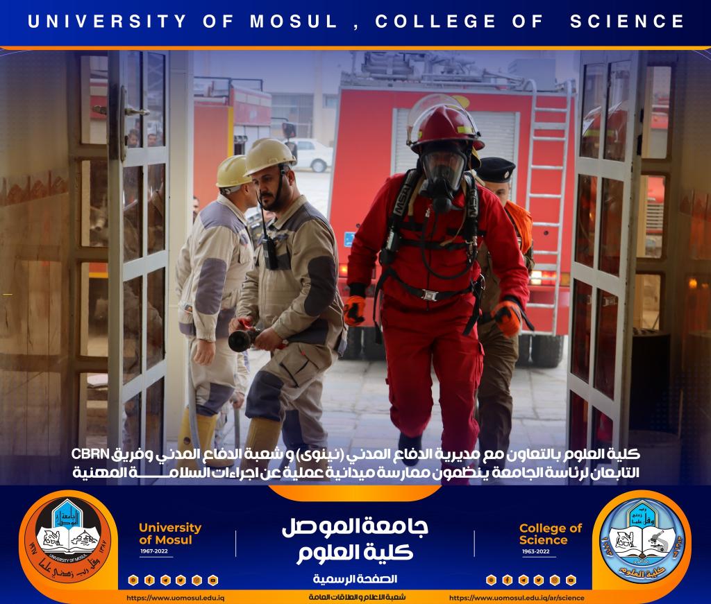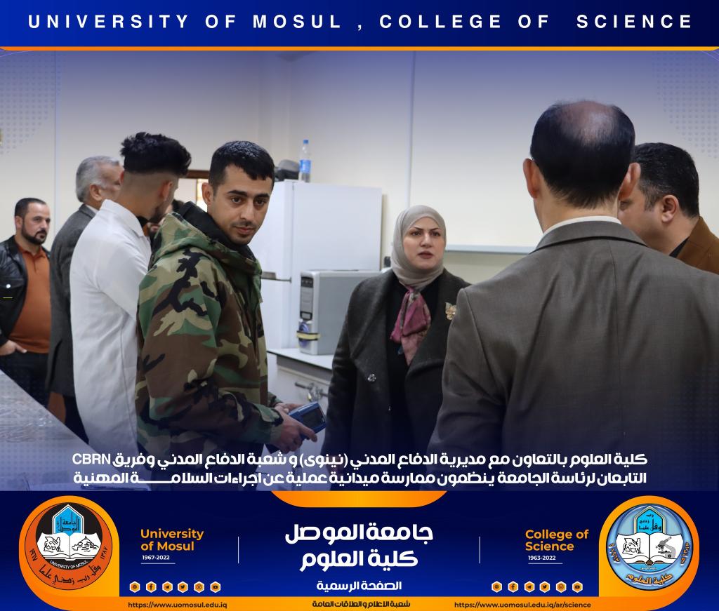 برعاية السيد رئيس جامعة الموصل الأستاذ الدكتور قصي كمال الدين الأحمدي، و بحضور السيد المساعد العلمي الاستاذ الدكتور منير سالم طه و السيد المساعد الاداري الاستاذ الدكتور وحيد محمود الابراهيمي وبإشراف وحضور السيدة عميد كلية العلوم الاستاذ الدكتورة هيام عادل ابراهيم، و مدير الدفاع المدني العقيد رائد عبد الله اللطيف والسيد مسؤول CBRN في الجامعة الدكتور مهند يقظان إضافة إلى السيد سفيان ادريس محمد مسؤول شعبة الدفاع المدني في الجامعة.جرت في كليتنا ممارسة ميدانية عملية عن اجراءات السلامة المهنية في المختبرات قام بها فريق مديرية الدفاع المدني / نينوى و شعبة الدفاع المدني و فريق CBRN التابعان لرئاسة جامعة الموصل صباح يوم الثلاثاء الموافق 13 كانون الأول 2022 في رحاب مختبرات قسم الكيمياء.هدفت الممارسة الى ترسيخ مفاهيم السلامة المهنية لدى المنتسبين و الطلبة من خلال اجراء مشاهد حية قامت بها فرق مختصة بكامل عُدَدِها من الجهات المشاركة عن كيفية التعامل مع الحرائق وانسكاب المواد الكيميائية في المختبرات، و ما هي الطرق المناسبة في التشخيص و التعامل و الوقاية من هذه المخاطر إضافة الى كيفية اخلاء الابنية دون التاثير وبث الذعر لدى المنتسبين و الطلبة الاخرين و كيفية اجراء الاسعافات الاولية للاصابات المحتملة للحيلولة دون تفاقمها.بدورها عبرت أسرة كلية العلوم ممثلة بعميدها بجزيل الشكر و خالص التقدير للأبطال من الفرق المشاركة في هذه الممارسة العملية القيمةالتي حضرها جمع غفير من منتسبي و طلبة الكلية و الجامعة و تاتي لتؤكد على أهمية التكاتف و التعاون المثمر بين دوائر و مؤسسات الدولة المختلفة في تطبيق اجراءات السلامة المهنية.لمشاهدة عرض فيديوي عن الممارسة العملية زيارة الموقع الرسمي لرئاسة جامعة الموصل على الرابط :https://fb.watch/honayqI1In/شعبة الإعلام والعلاقات العامةالثلاثاء 13 كانون الأول 2022