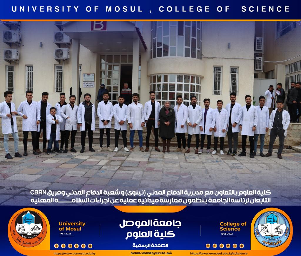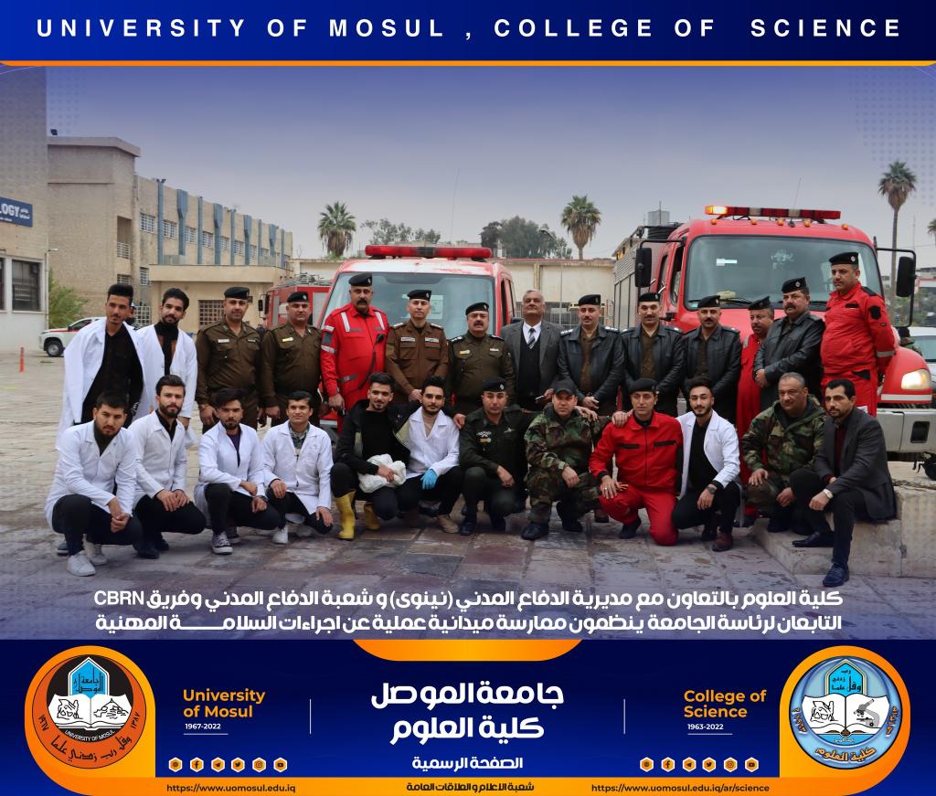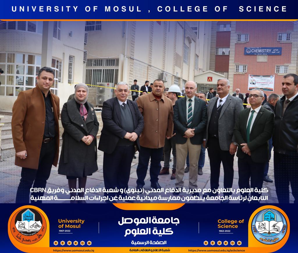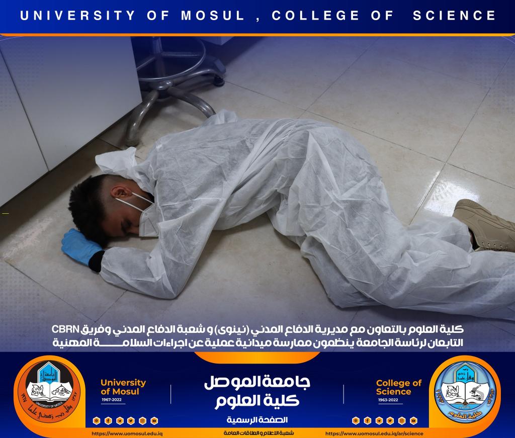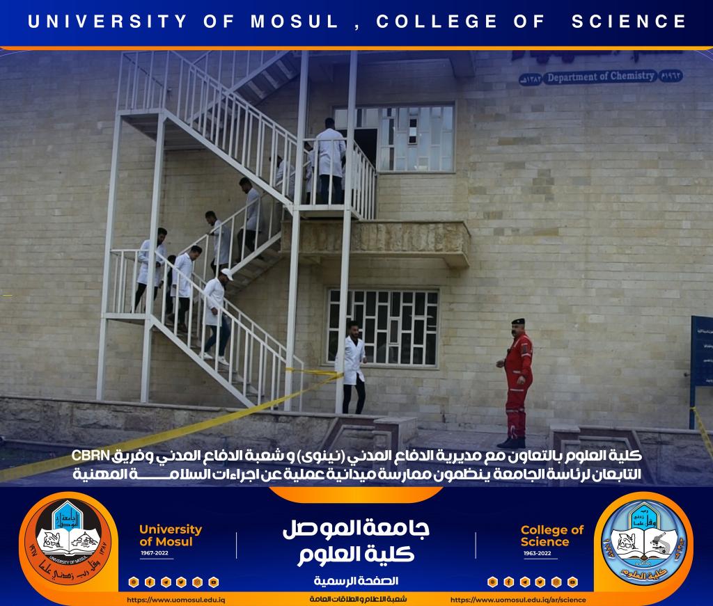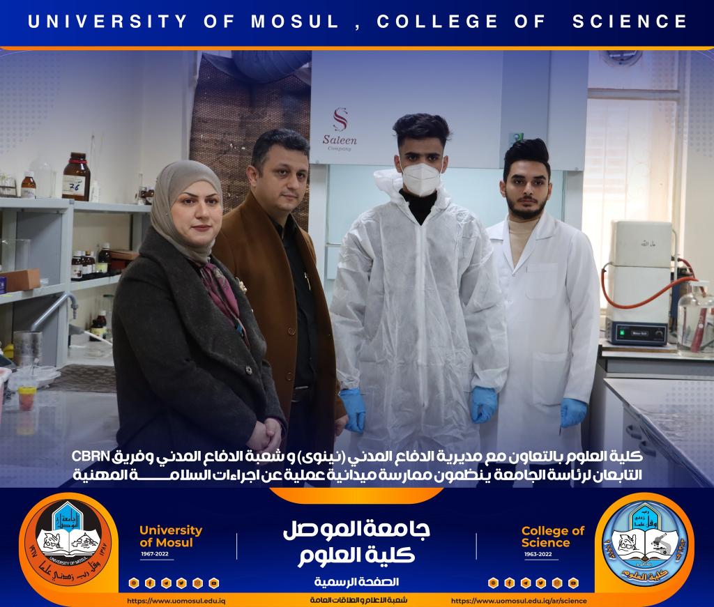 برعاية السيد رئيس جامعة الموصل الأستاذ الدكتور قصي كمال الدين الأحمدي، و بحضور السيد المساعد العلمي الاستاذ الدكتور منير سالم طه و السيد المساعد الاداري الاستاذ الدكتور وحيد محمود الابراهيمي وبإشراف وحضور السيدة عميد كلية العلوم الاستاذ الدكتورة هيام عادل ابراهيم، و مدير الدفاع المدني العقيد رائد عبد الله اللطيف والسيد مسؤول CBRN في الجامعة الدكتور مهند يقظان إضافة إلى السيد سفيان ادريس محمد مسؤول شعبة الدفاع المدني في الجامعة.جرت في كليتنا ممارسة ميدانية عملية عن اجراءات السلامة المهنية في المختبرات قام بها فريق مديرية الدفاع المدني / نينوى و شعبة الدفاع المدني و فريق CBRN التابعان لرئاسة جامعة الموصل صباح يوم الثلاثاء الموافق 13 كانون الأول 2022 في رحاب مختبرات قسم الكيمياء.هدفت الممارسة الى ترسيخ مفاهيم السلامة المهنية لدى المنتسبين و الطلبة من خلال اجراء مشاهد حية قامت بها فرق مختصة بكامل عُدَدِها من الجهات المشاركة عن كيفية التعامل مع الحرائق وانسكاب المواد الكيميائية في المختبرات، و ما هي الطرق المناسبة في التشخيص و التعامل و الوقاية من هذه المخاطر إضافة الى كيفية اخلاء الابنية دون التاثير وبث الذعر لدى المنتسبين و الطلبة الاخرين و كيفية اجراء الاسعافات الاولية للاصابات المحتملة للحيلولة دون تفاقمها.بدورها عبرت أسرة كلية العلوم ممثلة بعميدها بجزيل الشكر و خالص التقدير للأبطال من الفرق المشاركة في هذه الممارسة العملية القيمةالتي حضرها جمع غفير من منتسبي و طلبة الكلية و الجامعة و تاتي لتؤكد على أهمية التكاتف و التعاون المثمر بين دوائر و مؤسسات الدولة المختلفة في تطبيق اجراءات السلامة المهنية.لمشاهدة عرض فيديوي عن الممارسة العملية زيارة الموقع الرسمي لرئاسة جامعة الموصل على الرابط :https://fb.watch/honayqI1In/شعبة الإعلام والعلاقات العامةالثلاثاء 13 كانون الأول 2022
