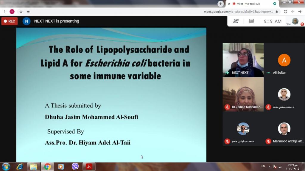 بإشراف السيدة عميد كلية العلوم الأستاذ المساعد الدكتورة هيام عادل إبراهيم الطائي تمت مناقشة أطروحة الدكتوراه للطالبة ” ضحى جاسم محمد ” من قسم علوم الحياة ، يوم الإثنين الموافق 2020/9/14 و الموسومة بـ(( The role of lipopolysaccharide and lipid A for Escherichia coli in some immune variables))تضمنت الدراسة إستخلاص متعدد السكريات الدهني( Lipopolysaccharide) و الدهن(