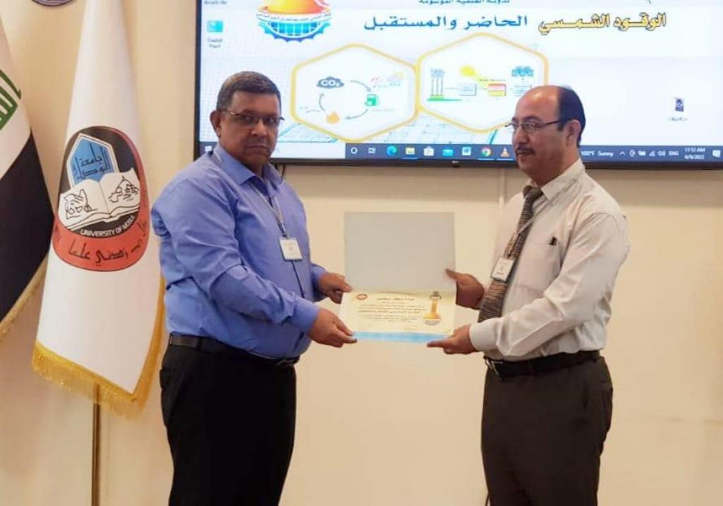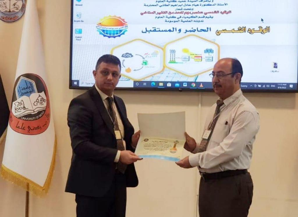 برعاية وحضور السيد رئيس جامعة الموصل الأستاذ الدكتور قصي كمال الدين الأحمدي وبإشراف السيدة عميد كلية العلوم الأستاذ الدكتورة هيام عادل إبراهيم ، و بمتابعة السيد رئيس قسم الكيمياء الأستاذ المساعد الدكتور سالم جاسم وتحت شعار ” الوقود الشمسي عنصر مهم للحد من التغير المناخي” أقام قسم الكيمياء في كلية العلوم ندوته العلمية الموسومة ” الوقود الشمسي بين الحاضر و المستقبل ” صباح يوم الخميس الموافق 9 حزيران 2022 وعلى رحاب قاعة أ.د. سعدالله توفيق سليمان للمؤتمرات ، حضرها السادة أعضاء مجلس الكلية و عدد من الشخصيات الاكاديمية والمحلية على مستوى جامعة الموصل و محافظة نينوى، اضافة الى جمع غفير من تدريسي القسم والكلية.تضمنت الندوة القاء أربع محاضرات : كانت المحاضرة الافتتاحية بعنوان (( الوقود الشمسي الحاضر والمستقبل)) القاها أ. د. رباح علي خليل / قسم الكيمياء وتلخصت المحاضرة حول التعريف عن الوقود الشمسي وأهميته في حل مشكلة التغير المناخي الذي أصبحت ملامح تأثيره واضحة وخصوصاً ان العراق من ضمن الاثنا عشر دولة الأكثر تضرراً بالتغير المناخي.أما المحاضرة الثانية فوسمت بعنوان (( تقنيات التحسس النائي في التغير المناخي )) القاها الأستاذ صباح حسين علي / مركز التحسس النائي / جامعة الموصل تناولت المحاضرة أهمية تقانات التحسس النائي في دراسة التغير المناخي والكشف عن غازات الاحتباس الحراري التي تنتج من النشاط البشري بصورة رئيسية بفعل العديد من الاستخدامات المضرة بالبيئة خصوصاً استخدام الوقود الاحفوري ( النفط – الغاز – الفحم ) في توليد الطاقة.في حين تطرقت المحاضرة الثالثة التي عنونت (( الغازات الصناعية المنبعثة عن الصناعات الكيميائية )) بإلقاء الخبير الكيمياوي الدكتور مطيع عبيد عبدالله / وزارة الصناعة والمعادن الشركة العامة لكبريت المشراق الى أزمة الطاقة العالمية وتهديدها في تغير المناخ وما ينبعث عن المصانع الكيمياوية من الغازات الصناعية كملوثات في الهواء كمصافي النفط والبتروكيمياويات ومصانع الاسمنت وما ينبعث من مداخنها من غازات ومصانع الرصاص والزنك كل هذه الانبعاثات تطرح الى الجو بحيث تتراكم لاحقاً في التربة .وكان عنوان المحاضرة الرابعة (( دور الكيمياء في دورة حياة غاز ثنائي أوكسيد الكاربون لتصنيع الوقود الشمسي )) القاها أ.م.د. مهند يقظان صالح / رئاسة جامعة الموصل / شعبة السيطرة على تداول المواد الكيمياوية والبايولوجية تطرقت المحاضرة الى ظاهرة الاحتباس الحراري وكيفية تحويل ثاني أوكسيد الكاربون الى مكونات أساسية لمركبات يتم استخدامها في مجالات مختلفة كتحويله الى الميثان.وقد خرجت الندوة بعدد من التوصيات وهي :-1- التشجيع على انتاج واستخدام الوقود الشمسي.2- الاستفادة من التجارب العالمية التي طورت قدراتها في مجال الوقود الشمسي .3- فتح باب الاستثمار أو التعاقد مع شركة سينهيليون السويسرية حول انتاج الوقود الشمسي في العراق.4- التوعية حول استخدام الوقود الشمسي لتوليد الكهرباء.5- ضرورة تبني مشروعات بحثية التي يجريها الباحثين لإيجاد مصادر طاقة بديلة يكون الوقود الشمسي واحداً منها.6- ضرورة زيادة الدعم لمنظومات البحث والتطوير والابتكار لإيجاد مزايا تنافسية وتطوير أسواق جديدة لمنتجات الطاقة.7- نشر ثقافة الوقود الشمسي في المجتمع وادخالها ضمن المناهج المتخصصة في المدارس والجامعات.8- تشكيل لجنة بإشراف ديوان محافظة نينوى بالتنسيق مع قسم البحث والتطوير وعضوية المؤسسات ذات العلاقة في الجامعة لتقديم رؤية موحدة وشاملة تخص محافظة نينوى وفق أهداف التنمية المستدامة العالمية والمعتمدة في وزارة التخطيط العراقية.9- اعتماد معطيات التحسس النائي في حسابات التلوث بالغازات الدفيئة والعناصر المناخية المؤثرة على التغير المناخي من خلال الاقمار الصناعية والواقع المعتمدة من الهيئة الدولية العالمية بتغير المناخ ( IPCC) .شهدت الندوة في ختامها توزيع شهادات المشاركة على السادة المحاضرين واللجان المنظمة للن