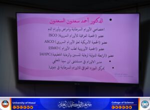 برِعايـةٍ مُباركـةِ من السيِّـد رئيس جامعـةِ الموصـل الأُستـاذ الدكتـور وحيـد محمـود الإبراهيمـي المُحتـرم وبإشـرافِ وتوجيـهِ السَّيِّــدة عميـد كُلِّيَّـةِ العلــومِ الأستـاذ الدكتـور هِيـام عـادِل إبراهيـم المُحتـرمــة وبمُتابعـةِ السَّيِّـد رئيـس قسـم علـومِ الحيــاةِ الأستـاذ الدكتـور أمجـد عبـد الهـادي محمَّــد المُحتـرم، أُقيــمَتْ في قسـم علـومِ الحيــاةِ نـدوةٌ عِلمِيَّـةٌ موسومـةٌ بـ (البكتريــا وبعـضُ نواتجِهـا، عـلاجٌ واعـدٌ للسَّرطــانِ)، علـى رحـاب قاعـة الدكتـور محمـود الحـاج قاسـم يـوم الثُّلاثاء الموافـق 22 نيسـان 2025 في السَّاعـة العاشـرة صباحـاً، تنـاوَبَ على القائِهـا كُـلٌّ مـن الأُستـاذ الدكتـور أميــرة محمــود الـرَّاوي والأُستـاذ الدكتـور رَيَّـان مـازِن فيصــل والدّكتـور أحمـد سعـدون حسَّـون السَّعـدون