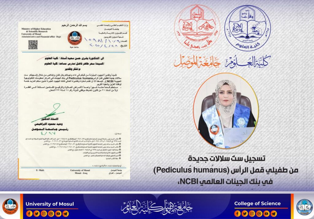 في إنجازٍ علميٍّ جديد، وفي إطار دعم كلية العلوم – جامعة الموصل للنشاطات البحثية وتشجيع الطاقات الأكاديمية الشابة، نُشر بحثٌ علميٌّ متميزٌ ضمن مستوعبات سكوبس (Scopus)، وهو ثمرة تعاونٍ بين الأستاذ المساعد الدكتور أوس إبراهيم سليمان، التدريسي في قسم علوم الحياة، وطالبتَي مشروع التخرج زهراء عبد المنعم محمد ونبأ رائد هاشم.