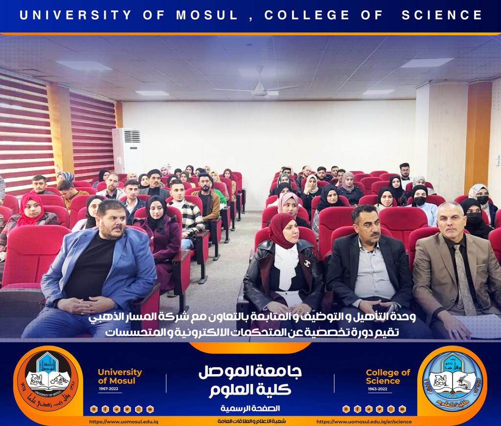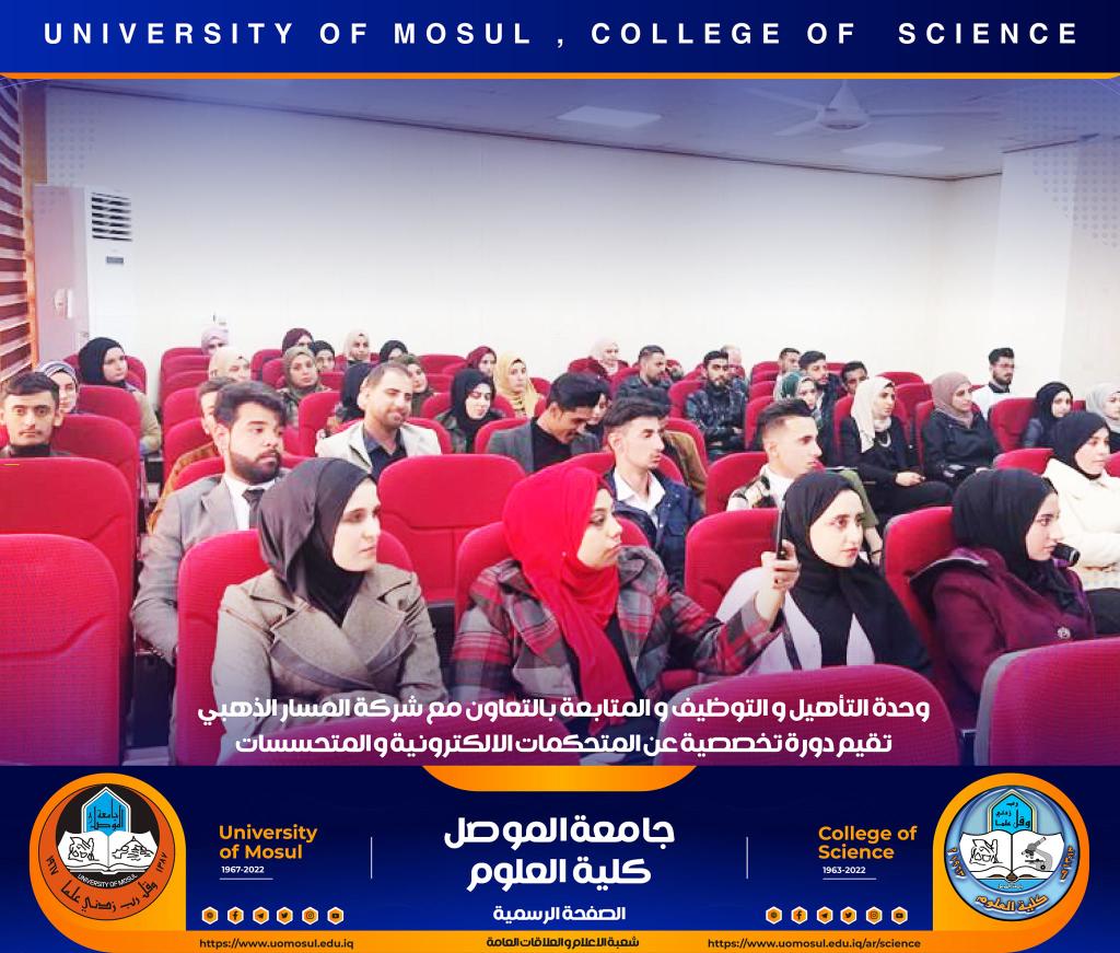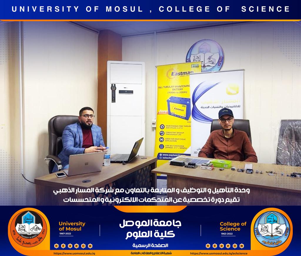 برعاية السيد رئيس جامعة الموصل الأستاذ الدكتور قصي كمال الدين الأحمدي وبإشراف وحضور السيدة عميد كلية العلوم الأستاذ الدكتورة هيام عادل إبراهيم ، أقامت وحدة التأهيل والتوظيف والمتابعة و بالتعاون مع شركة المسار الذهبي دورة تخصصية لطلبة المرحلة الرابعة في قسم الفيزياء بعنوان ” المتحكمات الالكترونية والمتحسسات وعلاقتها بأنظمة الطاقة الشمسية ” للمدة من 20 – 21 كانون الأول 2022.القى محاضرات الدورة كل من : أ. محمد بسمان غانم ، أ. زيد سعد يوسف ، أ. أحمد أمير عبد.كما هدفت الدورة الى تأهيل الطلبة للانخراط في سوق العمل ، و تناولت شرح المتحسسات الالكترونية التي هي عبارة عن مكوّنات إلكترونيّة دقيقة تقوم بتحويل ونقل الكميّات الفيزيائيّة ، من درجة الحرارة ، والأشعة غير المرئيّة ، والأشعة المرئيّة ، والضغط ، والحركة في المكان ، والشدّة الضوئيّة ، وغيرها ، إلى كميّات كهربائيّة والتي يترتّب عليها غلق أو فتح دائرة كهربائيّة لاستخدام هذه الحساسات وتوظيفها لأداء الأعمال واختيار المتحكمات مفتوحة المصدر لبناء المشاريع الإلكترونية قدمنا ورشة المتحكمات الالكترونية و أنواع المتحسسات.و تكشف أحد التقارير العالمية أن قطاع الطاقة الشمسية هو الأسرع نمواً بين مصادر الطاقة المتجددة ، حيث وصل عدد وظائفه في عام 2021 إلى 4.3 مليون وظيفة ، أي أكثر من ثلث القوى العاملة اليوم في وظائف الطاقة المتجددة حول العالم.شعبة الإعلام و العلاقات العامةالأحد 25 كانون الأول 2022