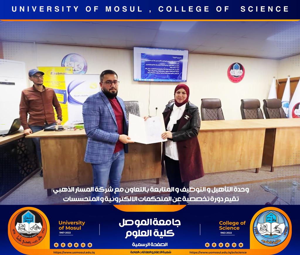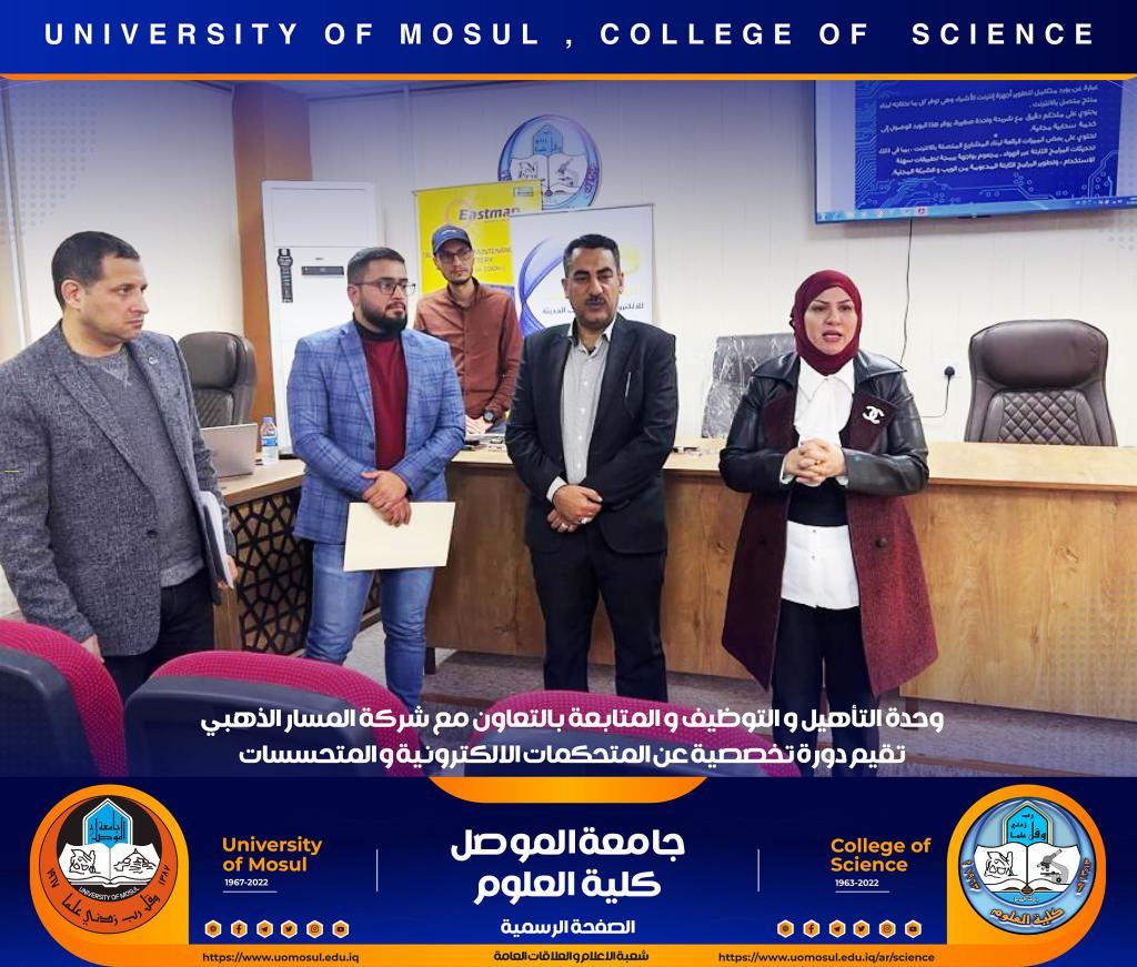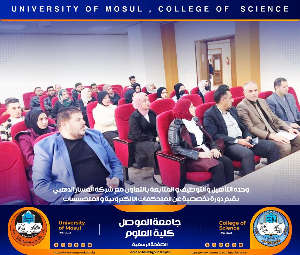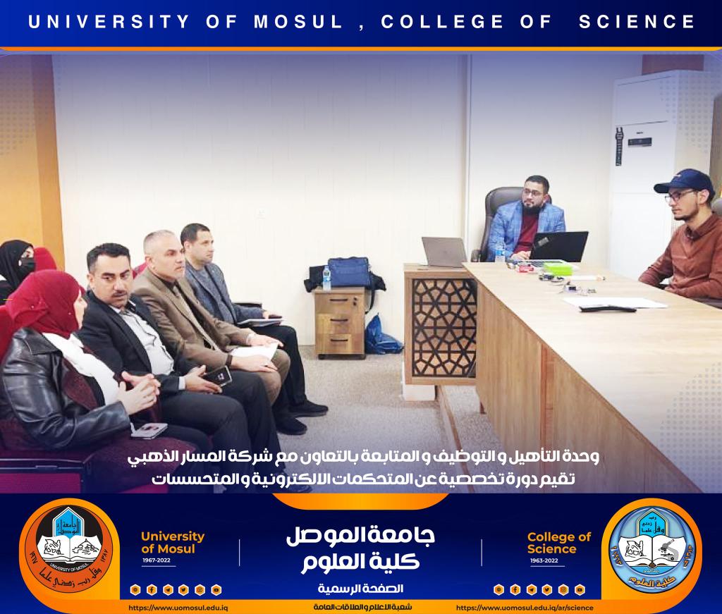 برعاية السيد رئيس جامعة الموصل الأستاذ الدكتور قصي كمال الدين الأحمدي وبإشراف وحضور السيدة عميد كلية العلوم الأستاذ الدكتورة هيام عادل إبراهيم ، أقامت وحدة التأهيل والتوظيف والمتابعة و بالتعاون مع شركة المسار الذهبي دورة تخصصية لطلبة المرحلة الرابعة في قسم الفيزياء بعنوان ” المتحكمات الالكترونية والمتحسسات وعلاقتها بأنظمة الطاقة الشمسية ” للمدة من 20 – 21 كانون الأول 2022.القى محاضرات الدورة كل من : أ. محمد بسمان غانم ، أ. زيد سعد يوسف ، أ. أحمد أمير عبد.كما هدفت الدورة الى تأهيل الطلبة للانخراط في سوق العمل ، و تناولت شرح المتحسسات الالكترونية التي هي عبارة عن مكوّنات إلكترونيّة دقيقة تقوم بتحويل ونقل الكميّات الفيزيائيّة ، من درجة الحرارة ، والأشعة غير المرئيّة ، والأشعة المرئيّة ، والضغط ، والحركة في المكان ، والشدّة الضوئيّة ، وغيرها ، إلى كميّات كهربائيّة والتي يترتّب عليها غلق أو فتح دائرة كهربائيّة لاستخدام هذه الحساسات وتوظيفها لأداء الأعمال واختيار المتحكمات مفتوحة المصدر لبناء المشاريع الإلكترونية قدمنا ورشة المتحكمات الالكترونية و أنواع المتحسسات.و تكشف أحد التقارير العالمية أن قطاع الطاقة الشمسية هو الأسرع نمواً بين مصادر الطاقة المتجددة ، حيث وصل عدد وظائفه في عام 2021 إلى 4.3 مليون وظيفة ، أي أكثر من ثلث القوى العاملة اليوم في وظائف الطاقة المتجددة حول العالم.شعبة الإعلام و العلاقات العامةالأحد 25 كانون الأول 2022